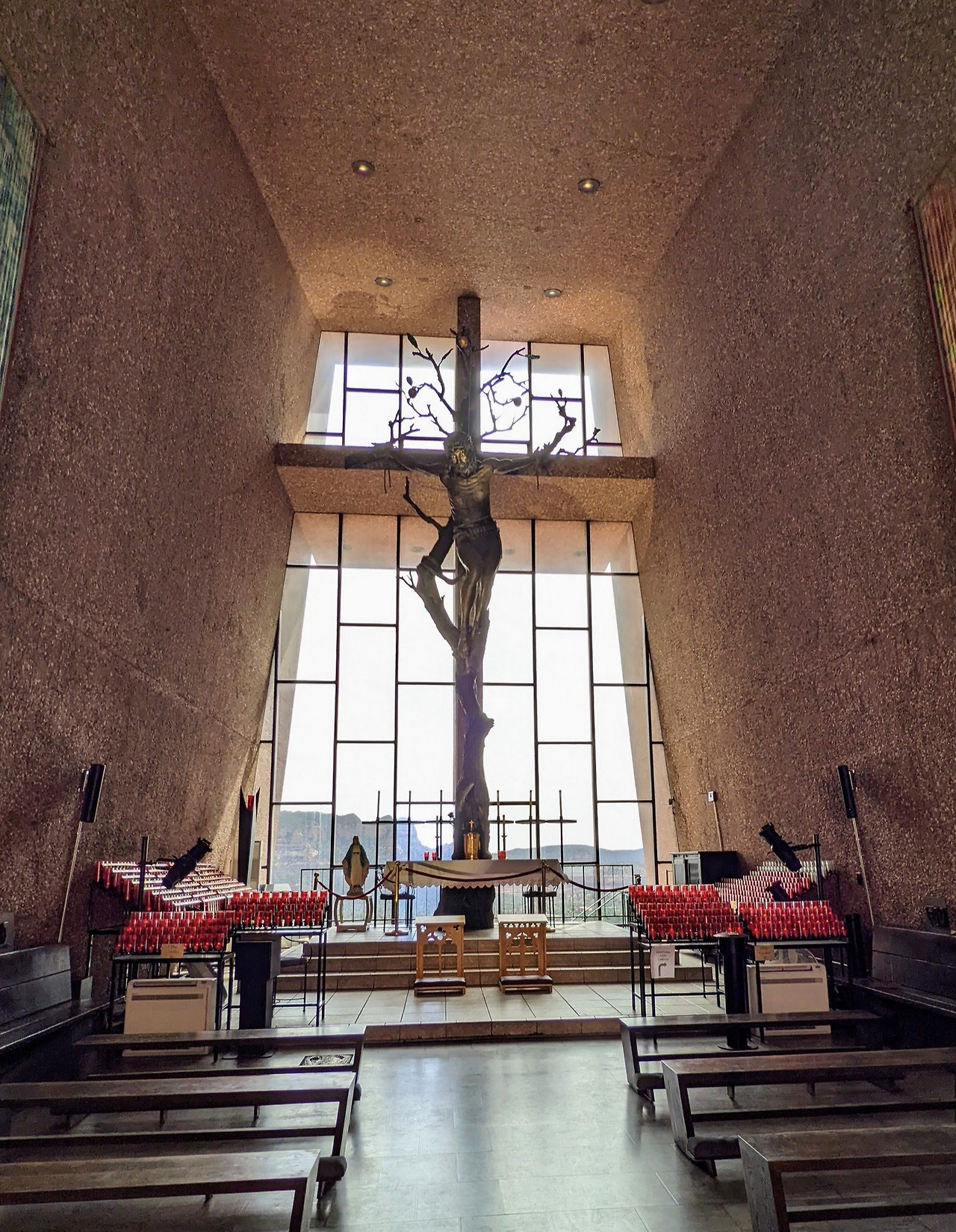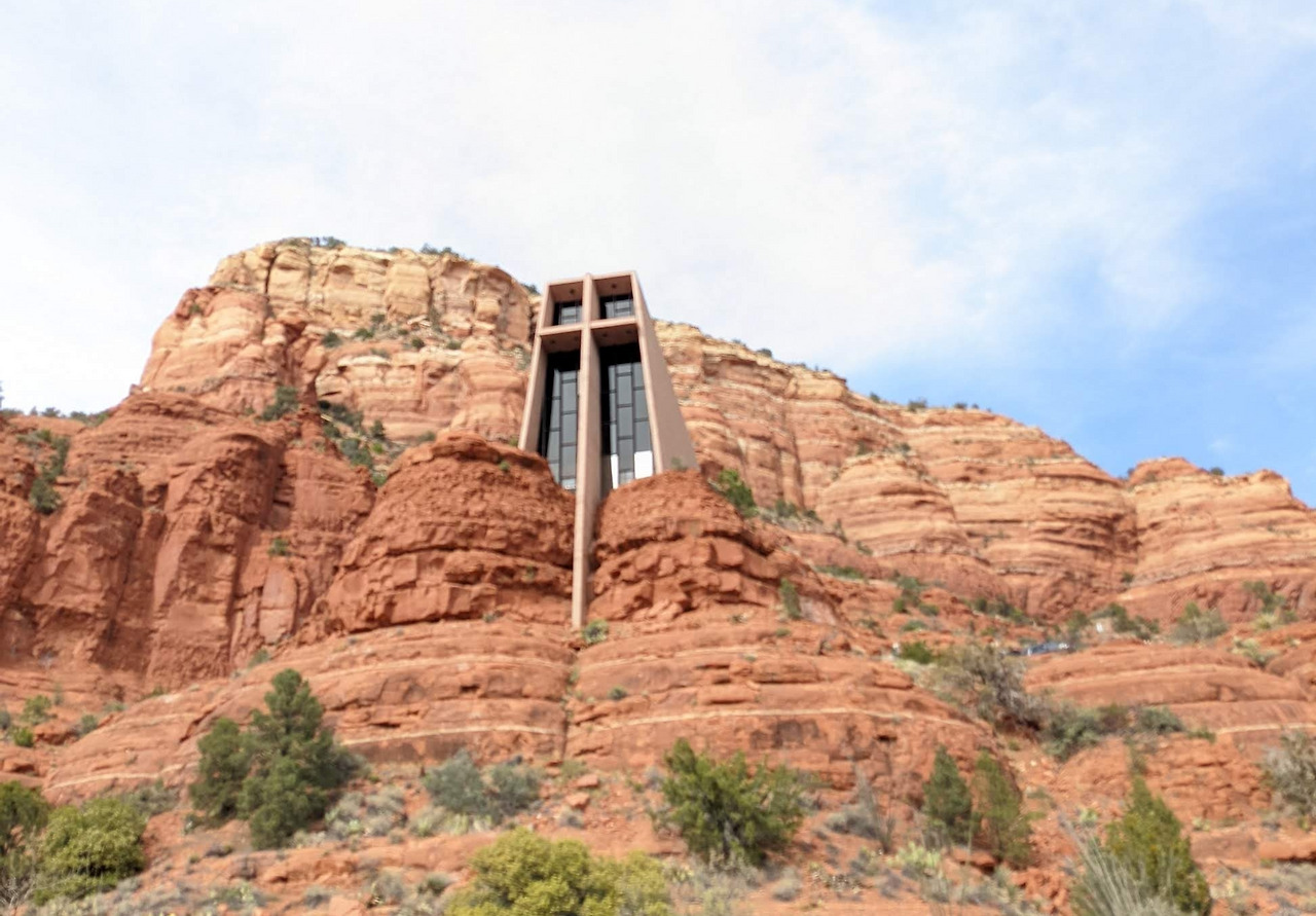 'Recreatio.gov'에서 예약이 가능한 Majanita 캠핑장은 세도나 시내를 들어가기 전 89A 도로상에 있는데 캠핑장으로 들어가는 입구가 워낙 작아 하마터면 놓칠 뻔했다. 마지막하나 남았던 사이트를 예약했기에 사이트 위치는 그리 좋지 않았다. 시내로 향하니 입구부터 거리가 사람으로 가득 차 있다. 나의 첫 번째 목적지는 Holy Cross Chapel이었다. 이 성당은 엠파이어 스테이트 빌딩에 영감을 받아 1956년에 완성되었는데 단지 150명을 수용할 수 있는 작은 성당이다. 이 성당이 특이한 것은 바위 산 Bute 지형 위에 지어진 것으로 이교회를 짓기 위해 25톤이나 되는 바위를 다이너마트를 사용하지 않고 제거했다고 한다. 주택가의 좁은 도로를 지나 성당의 작은 주차장에 도착했다. 워낙 인터넷으로 사진을 많이 봤었는데 실제로 보니 생각보다 훨씬 작은 크기에 놀랐다. 안으로 들어가니 한 쪽면 전체가 유리로 되어있는 원룸으로 심플한 구조였다. 거대한 십자가의 예수상이 유리벽 앞에 세워져 있다. 제단 밑에서 시작되는 나무가 벽면 중앙에 세워져 있는데 나무는 두 개의 줄기로 나누어져 있다. 하나의 곁 줄기는 이슬라엘 10지파를 다른 하나는 유대 2 지파를 상징한다고 한다. 이스라엘을 상징하는 곁줄기는 예수가 매달린 십자가로 쓰이고 유대를 상징하는 본 줄기에는 생명의 상징인 황금색의 사과 세 개와 열두 제자를 상징하는 12개의 나뭇잎이 매달려 있었다. 건축상을 몇 번 수상했다고 하는데 이 건물의 매력은 외부구조물과 이 건물이 세워져 있는 주위 환경인 것 같다.