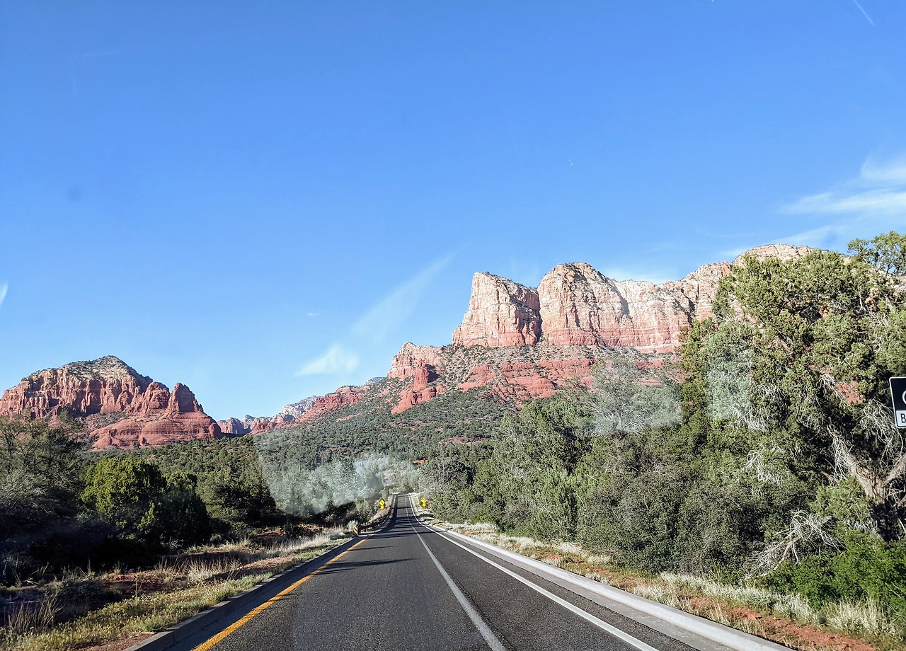 Petrified Forest 국립공원을 떠나 다시 서쪽으로 이동했다. 그랜드 캐년에서 가장 가까운 도시인 Flagstaff를 지나 세도나를 향했다. 세도나가 가까워지고 Oak Creek scenic drive에 접어들자 울창한 침엽수림이 펼쳐지고 끊임없이 하강하며 굽어 도는 도로를 14마일가량 운전하고 내려갔다. 한국의 지리산 노고단 도로처럼 계속 굽이치며 하강하는 도로다. 운전을 조심하느라 여유롭게 경치를 관망하지는 못했지만 빼어난 경관들을 연속적으로 보다 보니 웬만한 경치는 큰 감동을 주지 못해 아쉬움이 든다. 그러나 여전히 아름답다.
