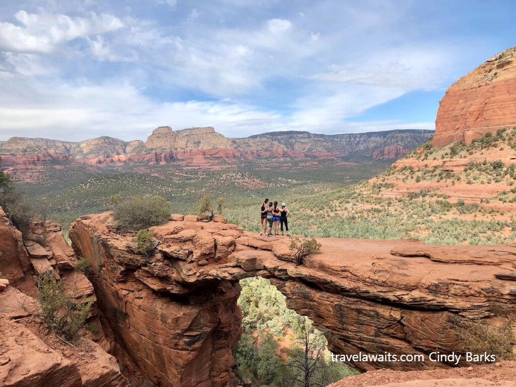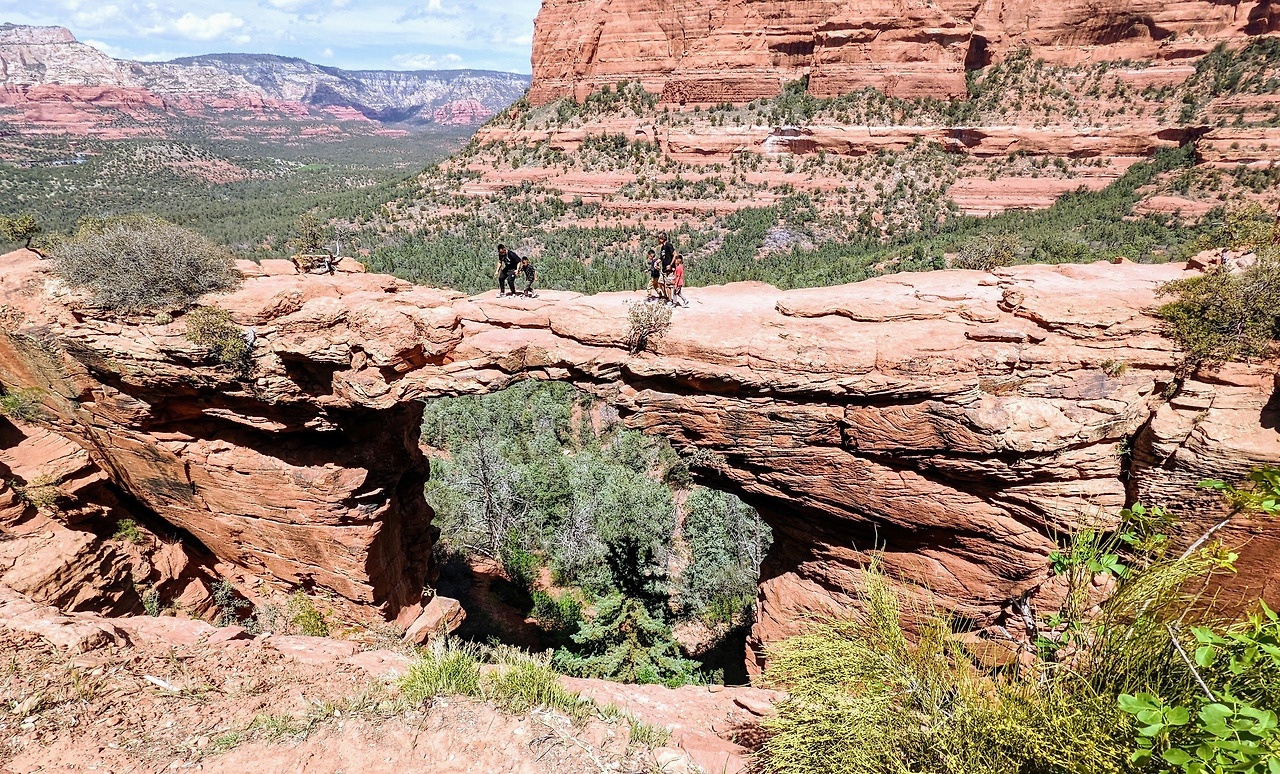 셋째 날 아침에 세도나에서 유명한 명소인 Devil's Bridge로 갔다. 이 트레일은 세도나에서 가장 유명한 트레일중 하나로 Cathedral Rock처럼 사람들로 붐볐다. 원래는 왕복 3km가 안 되는 트레일인데 Devil's Bridge 주차장까지 가기 위해선 아주 거친 비포장 자갈길을 거쳐가야 하기에 보통 다른 주차장에 차를 세우고 걸어서 Devil's Bridge 주차장까지 간 후 거기서 다시 트레킹을 해야 하므로 7km 정도를 걸어야 한다. 도착하니 다리 위에서 사진을 찍기 위해 순서를 기다리는 사람들의 줄이 길게 늘어서있다. 가끔씩 사진을 찍으며 특이한 포즈를 취하며 쇼맨 쉽을 보이는 사람들이 있는데 앉아서 구경하던 여행객들의 갈채와 환호를 받기도 한다. 열 살 남짓 보이는 남자아이가 아버지와 사진을 찍다가 한 손으로 바닥을 짚고 거꾸로 서는 브레이크 댄스 포즈를 취하자 구경하던 사람들이 열렬한 환호를 한다.