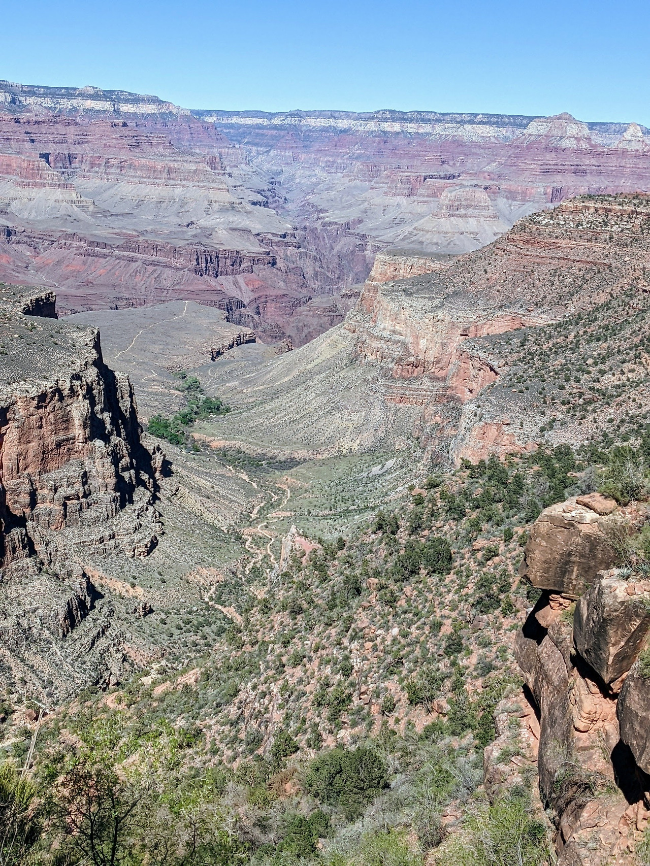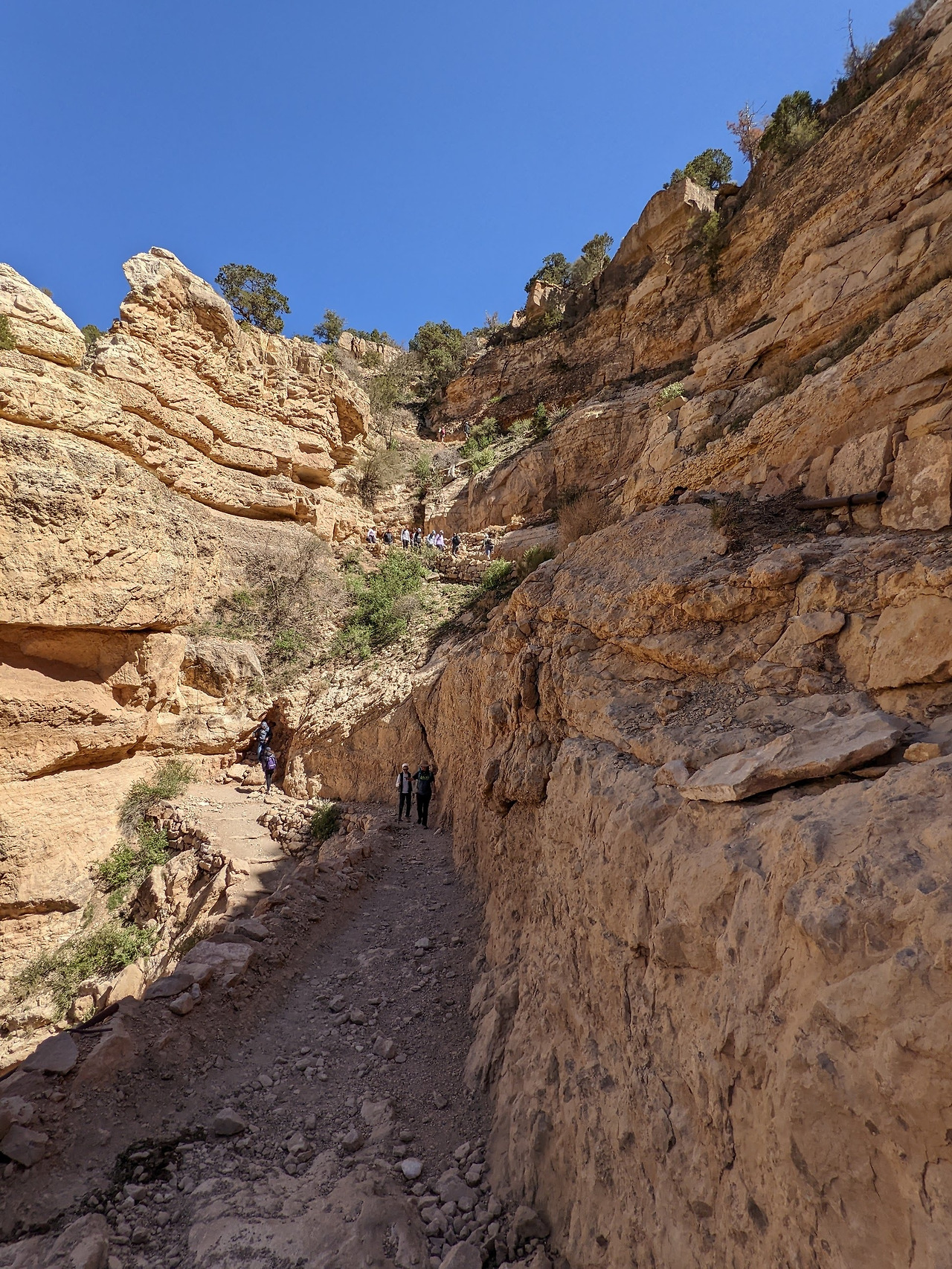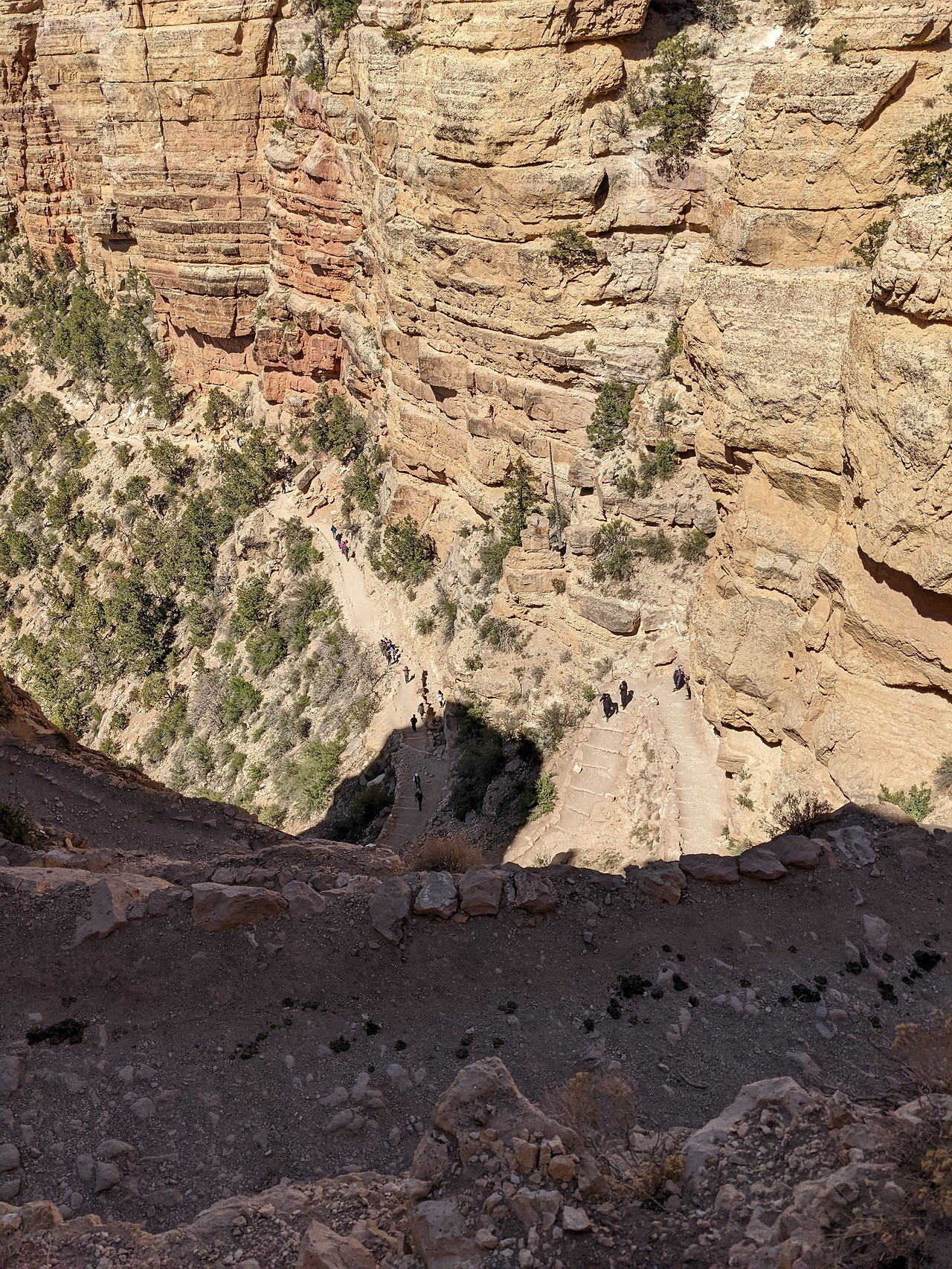 전망대에서 멀리 보이던 캐년을 가깝게 보며 그 장엄함과 아름다움에 감탄하며 트레일을 내려가다가 이 내려온 길을 다시 올라갈 생각을 하니 계속 내려갈 수가 없어, 1.5마일 휴식 구간을 지나 2마일이 채 되지 않는 지점에서 돌아섰다. 돌아갈 때 2 마일 이상의 경사를 계속 올라가는 건 너무 무리인 것 같아서다. 나처럼 추운 날씨에 이 길을 트레킹하는 것이 여름 더운 날씨에 하는 것보다는 몇 배로 나을 것 같다. 아이들과 같이 오는 부모들은 물과 스낵을 단단히 준비해 와서 1.5 마일이나 그전에서 돌아가는 것이 안전할 것 같다. 1마일 정도만 내려와도 충분히 전망대와는 색다른 그랜드 캐년을 경험할 수 있기 때문이다. 트레킹 폴이 없었다면 도저히 올라오지 못했을 길을 한걸음 한걸음 할머니가 고갯길을 올라가는 속도로 올라왔다.