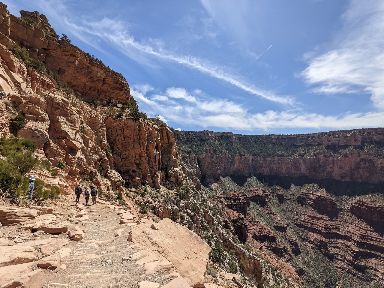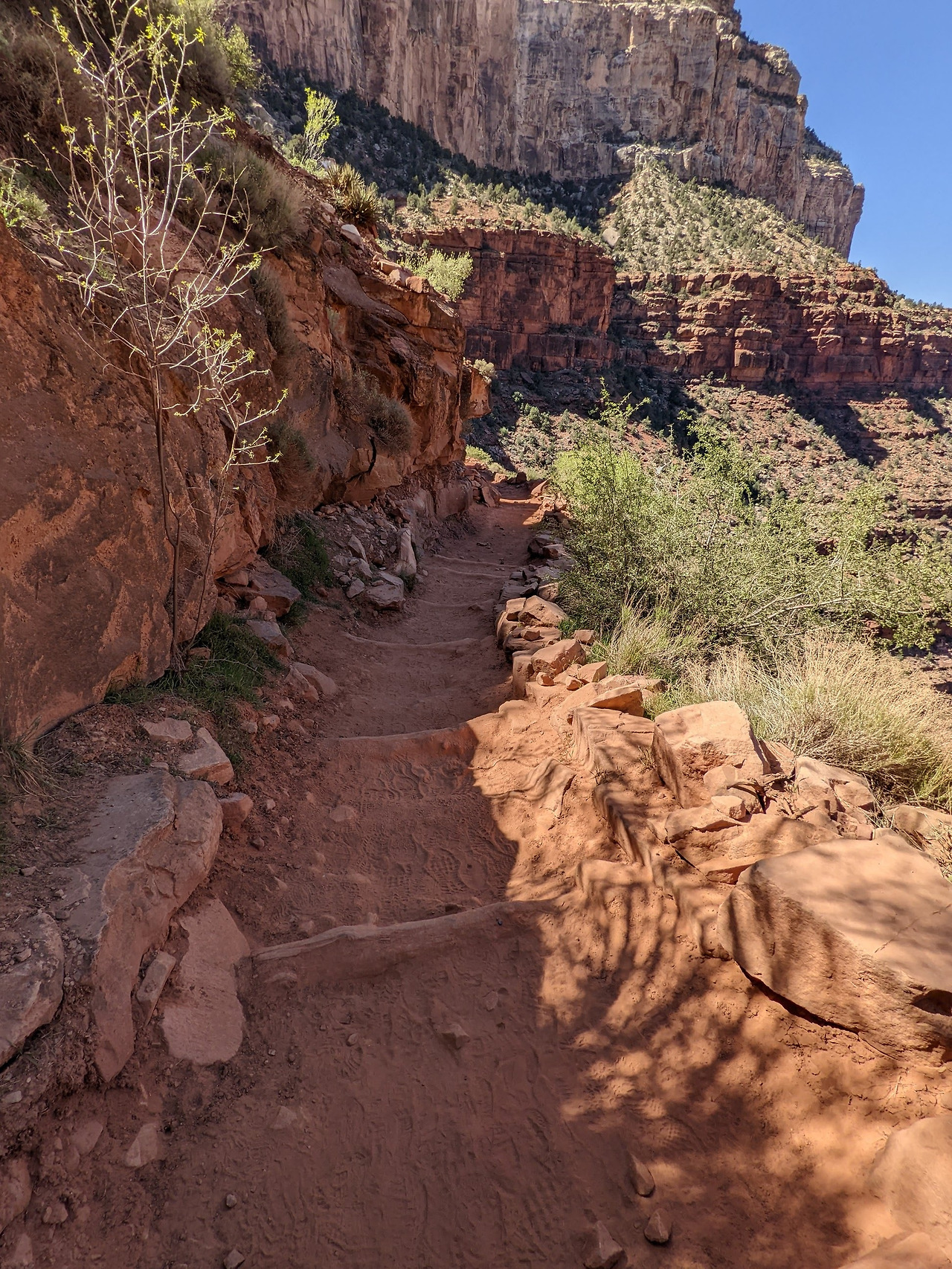 그랜드 캐년에 전해 오는 러브 스토리가 있는데 1929년에 그랜드 캐년 South Rim에서 박물학자로 일하던 Eddie Mckee라는 사람이 있었다. 그는 당시 North Rim에서 일하던 여자 친구를 만나기 위해 휴일이면 South Rim에서 North Rim까지 왕복 무려 80km를 하이킹해서 갔다고 한다. 이러한 그의 놀라운 정성이 그녀를 감동시켜 마침내 그녀는 Eddie Mckee를 중간지점인 Phantom Ranch에서 만나기로 했다고 한다. 휴일에 80km를 걸어 사랑하는 사람을 만나러 가기 위해선 잠자는 시간 이외에는 계속 걸어야 했을 것이다. 그리고 몇 시간을 보고 다시 그 먼 길을 돌아와야 했을 것이다. 걷는데 훈련이 된 사람이 휴식을 취했을 때 하루에 걸을 수 있는 거리가 32km, 휴식을 취하지 않을 경우 48km라고 한다. 그러나 이것은 보통의 길을 걸을 때의 이야기고 길도 잘 정비되어 있지 않고 경사가 심한 바위 산길 80km를 계속 걷는 것은 상상이 되지 않는다. 그 여성이 어찌 감동하지 않을 수 있을까? 그 당시에 North Rim에서 Phantom Ranch까지 혼자 하이킹을 매번 한 그의 부인도 대단한 사람이다. 그는 그랜드 캐년의 바닥을 흐르는 Bright Angel Creek에서 그녀에게 청혼해 마침내 그녀와 결혼했다고 한다. 그 후 11년 동안 그랜드 캐년에서 일하고 그들이 사망한 후 South Rim에 있는 묘지에 묻혔다고 한다. 지금 내가 가는 이 길은 그 시절 Eddie Mckee가 설렘을 안고 부지런히 걸었던 길일 거다.