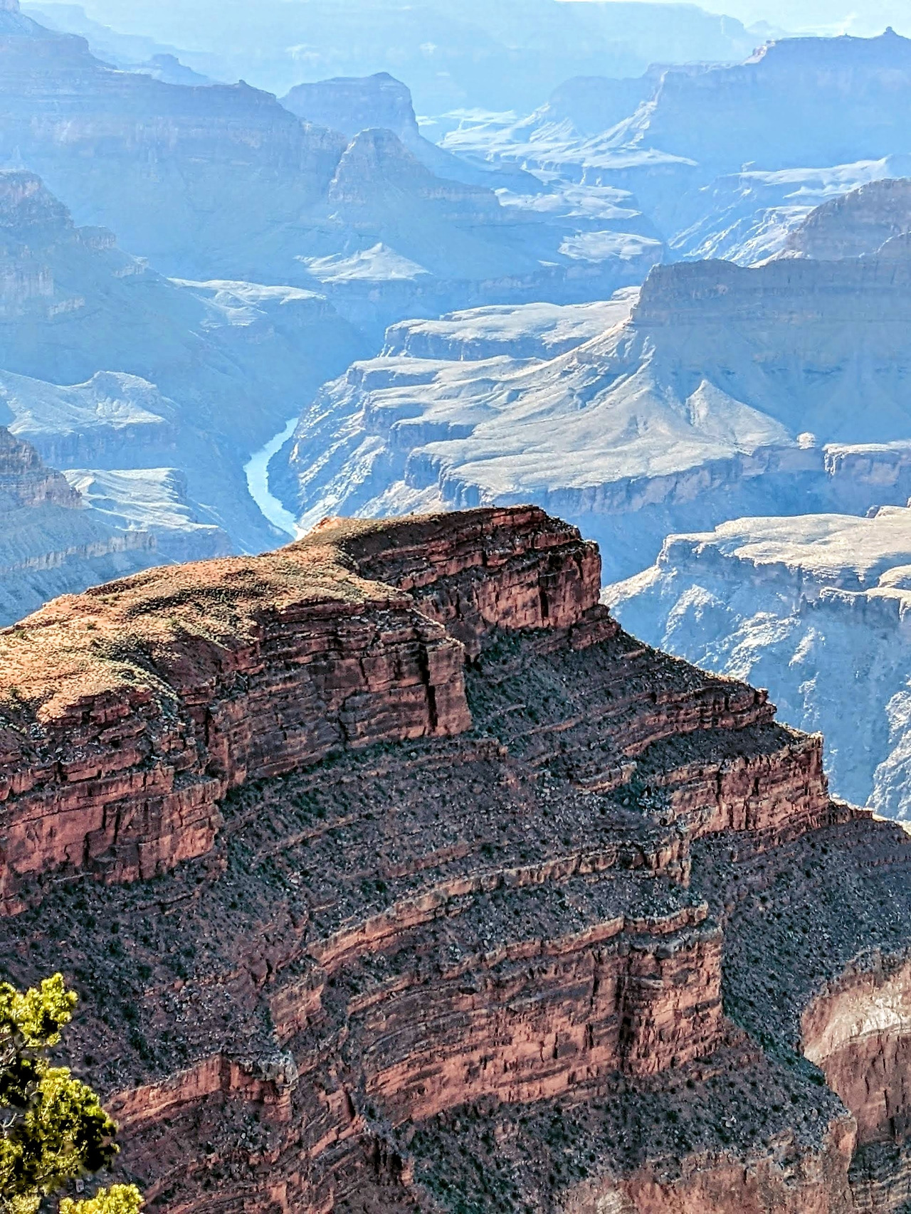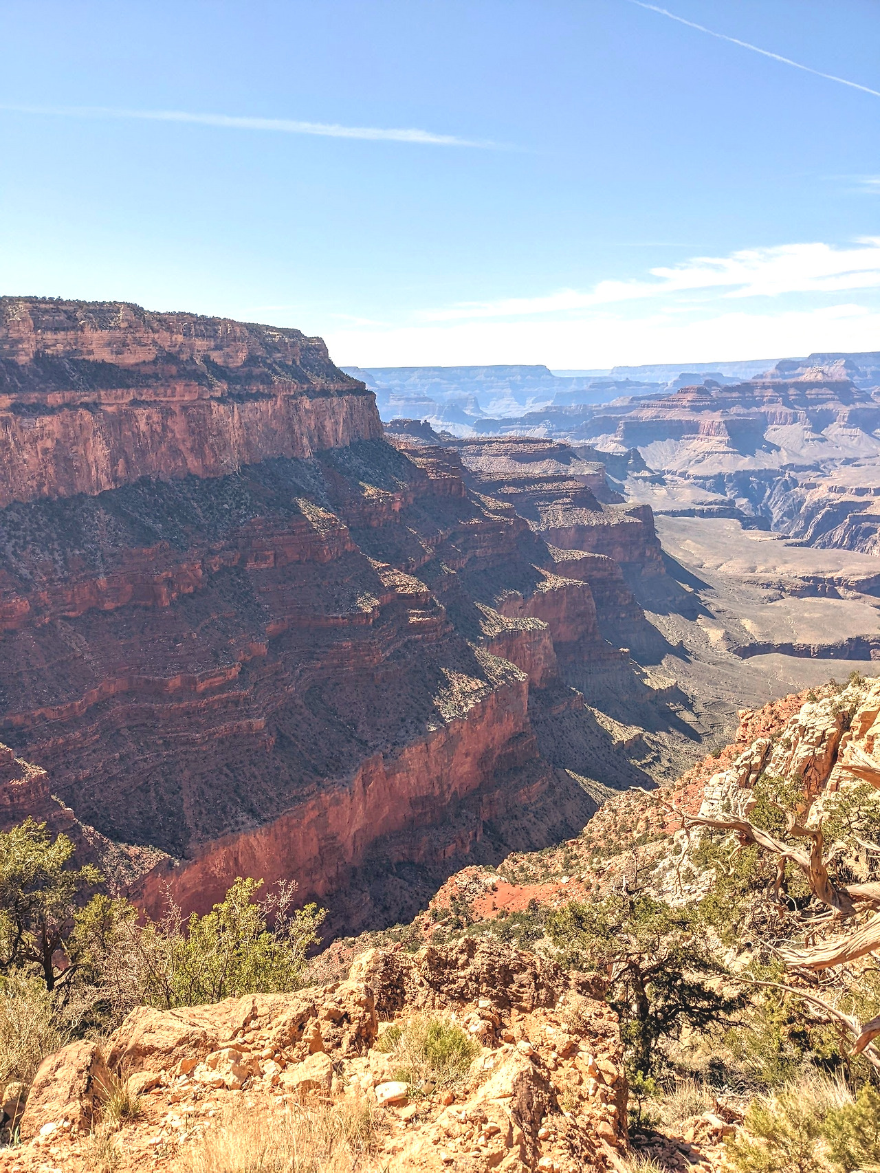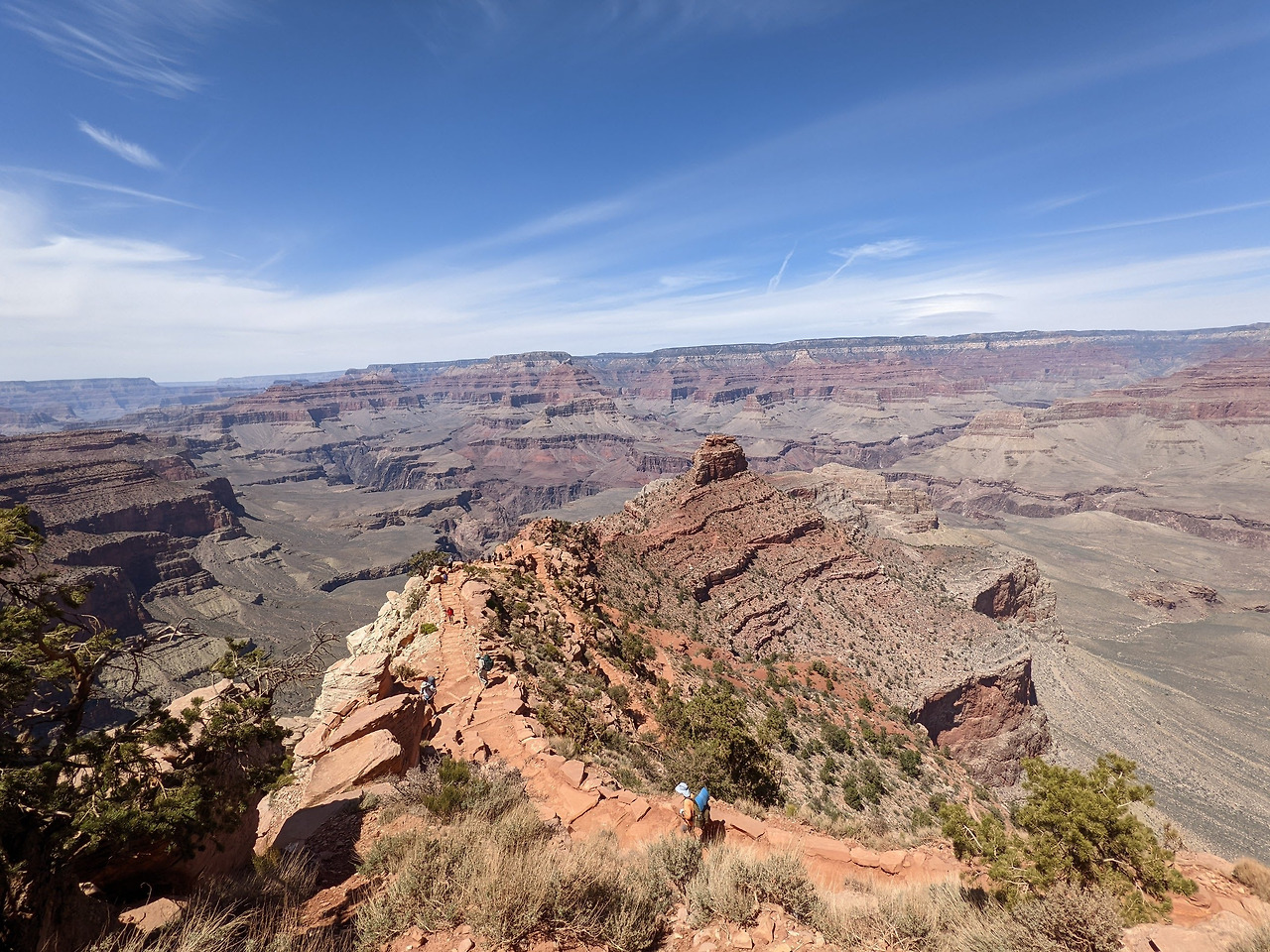 South kaibab trail은 Skeleton Point까지 약 왕복 9.6km, Phantom Ranch까지 왕복 25.6km이며 약 1460미터의 고도차이가 나서 Bright angel trail 보다도 가파르다. 그래서 많은 사람들이 South kaibab trail로 내려가서 Bright angel trail로 올라오는 경로를 택하기도 한다. 트레킹을 시작하고 30-40분이 지났는데 바람이 너무 심해지고 추워져서 포기하고 되돌아왔다. 오다가 셔틀버스에서 만난 노부부가 Desert View Drive가 좋다고 꼭 가보라고 했다. 내가 Sout kabaib trail을 가다가 포기하고 왔다고 하니 자신들은 South kaibab trail을 어제 갔다 왔는데 자신들이 그랜드 캐년에서 가장 좋았던 곳이라고 이 역시 꼭 가보란다.