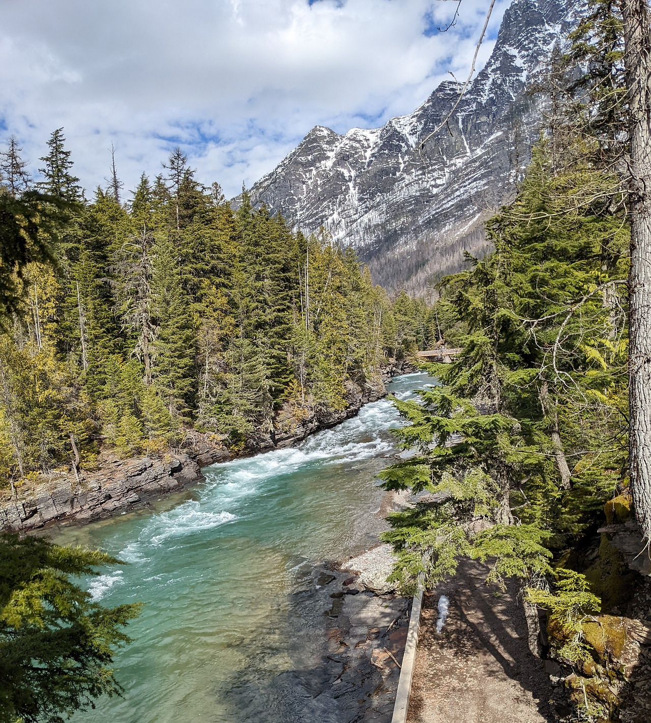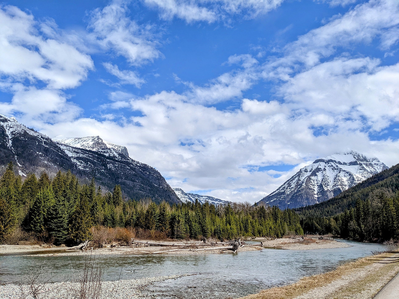 다음 날 아침 호수 앞에서 아침을 먹은 후 McDonald lodge로 다시 갔다. 주차장에 차를 세운 후 Going to the sun road 앞에 쳐 놓은 바리케이드 사이로 걸어 들어갔다. 역시나 사람이 보이지 않는다. 내가 일찍 나와서 사람이 더 없는 것 같았다. 도로를 걸어가며 보는 경치는 정말 아름답다. 저 멀리 빙하 덮인 산들이 보이고 옛날 달력에서나 봄 직한 침엽수림의 경치가 강물 소리와 함께 눈앞에 펼쳐진다. 오늘은 이 것 말고는 다른 일정이 없으니 급할 것도 없어 경치를 즐기며 유유자작 걸었다. 여름이었으면 차를 타고 지나가며 편하게 구경했을 것이지만 편한 대신 놓치는 것도 많다. 중간중간 전망 포인트가 있고 트레일로 나가는 출구도 있다. 돌아오는 길에 기운이 남아있으면 잠깐 나가서 탐험해 볼까 생각해 본다. 그런데 과연 그럴 기운이 남아 있을지 모르겠네.