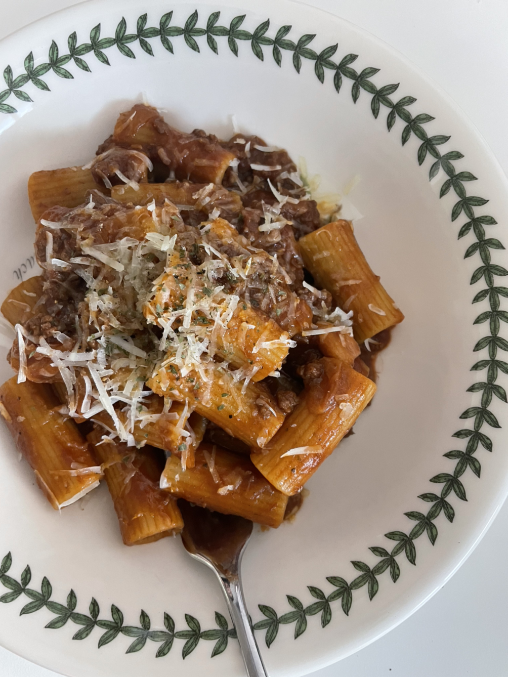 7. 예쁜 접시에 라구 리가토니 파스타를 담습니다. 파마산 치즈나 페코리노 치즈가 있다면 위에 치즈를 뿌려줍니다. 후추도 살짝 갈아주세요.
