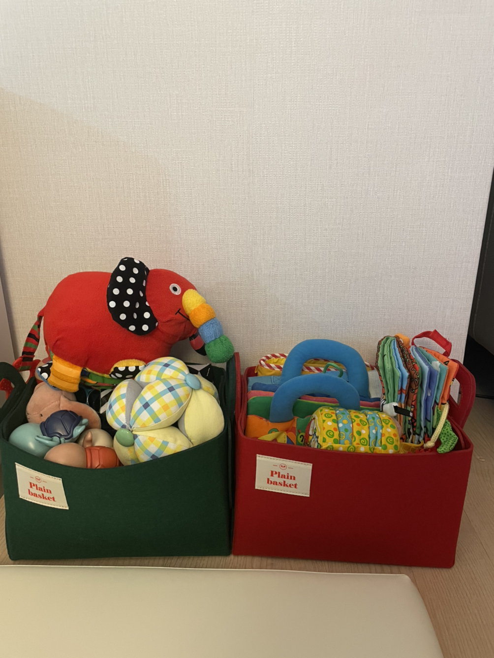 장난감은 (제 기준으로) 너무 많아 사진으로 첨부해 볼게요. 지금 사용 중인 장난감만 모여 있어요. 블록이나 퍼즐 같은 장난감은 창고에서 대기 중이지요. 저기서 제가 직접 산 장난감은 태엽을 감으면 파닥 거리는 세 마리에 구천 원짜리 거북이 인형이 전부입니다.