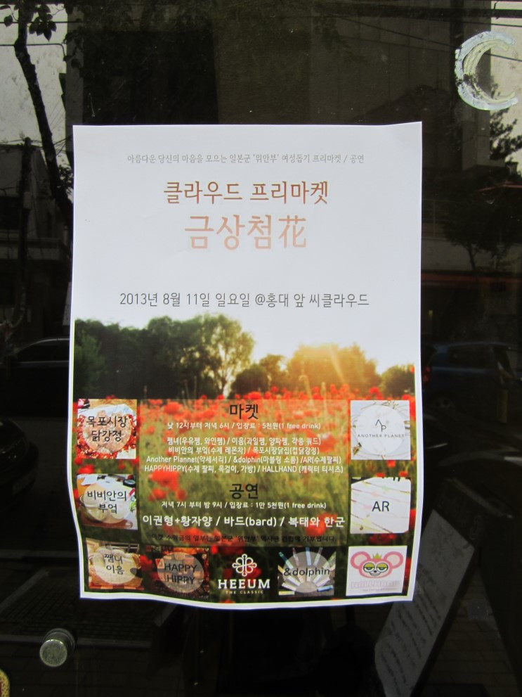 몇 달 후 나는 공연기획자 ㅋ에게 공연섭외를 받았다. ‘금상첨화’라는 타이틀을 가진 그 공연은 위안부 역사관 설립 후원을 위해 수익금을 기부한다는 취지를 갖고 있었다. 물론 나 개인이 아닌 팀 ‘게으른 오후’를 섭외한 것이었으나 당시 우리 팀은 이미 서로 모이기가 힘들어 어쩌다 한 번씩 만나는 수준이었기에 나는 고민에 빠졌다.