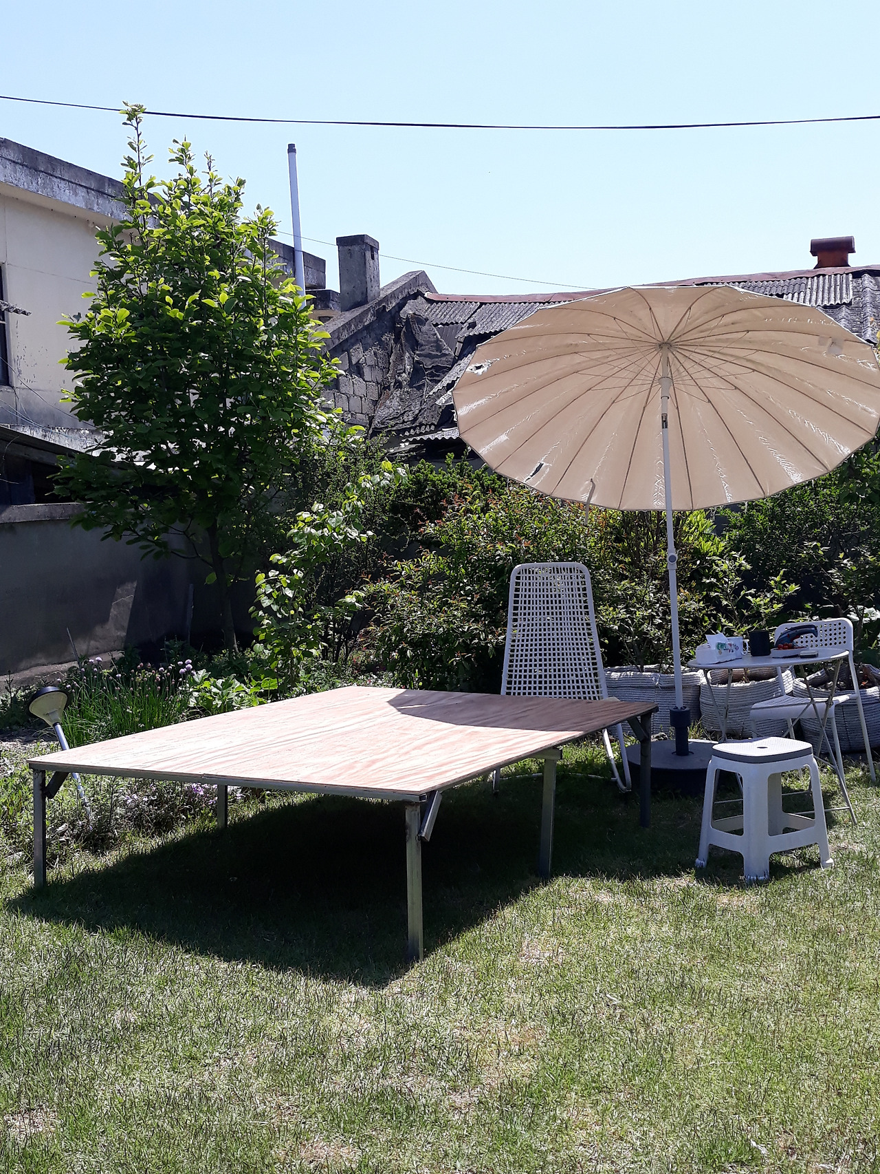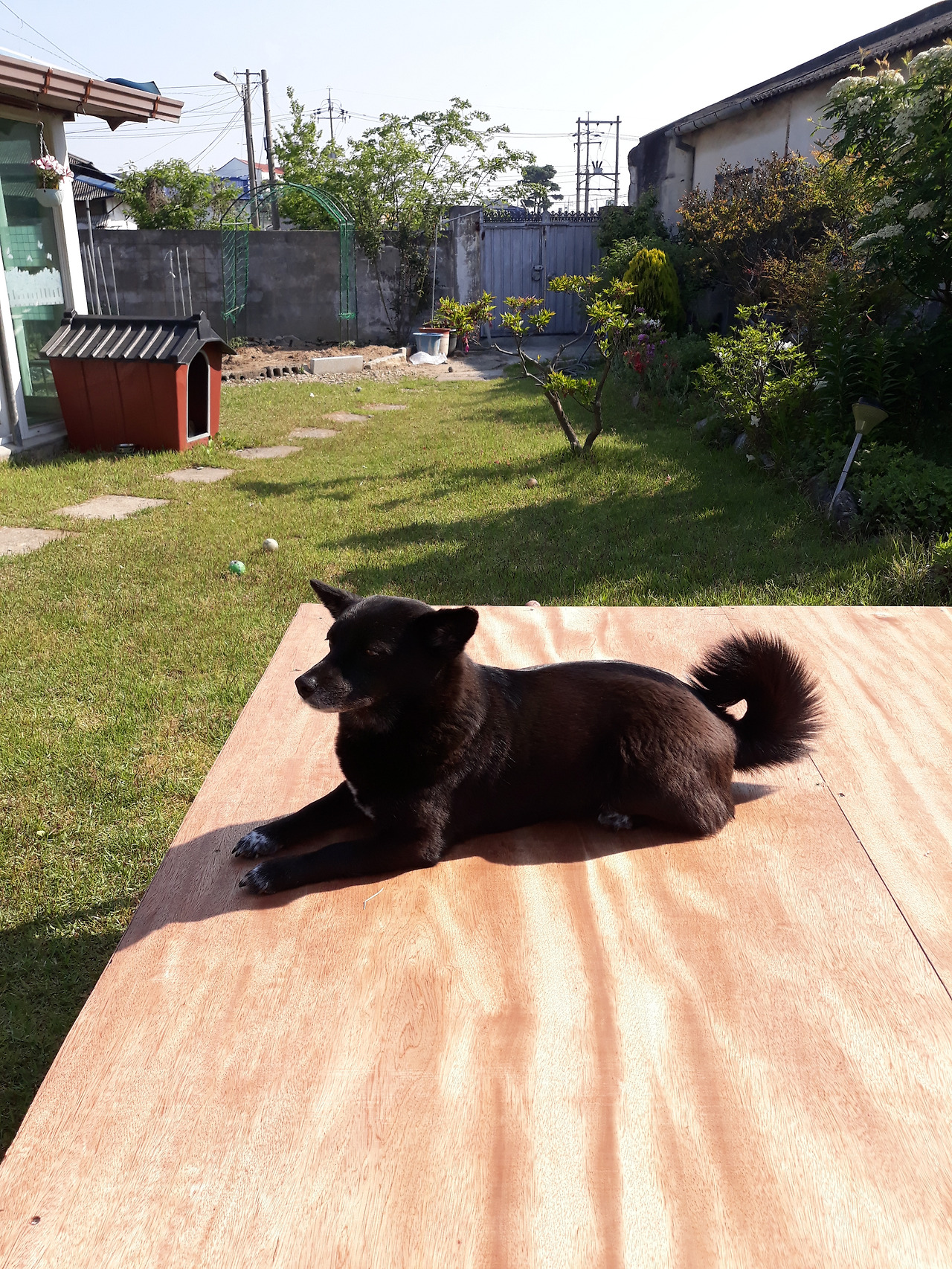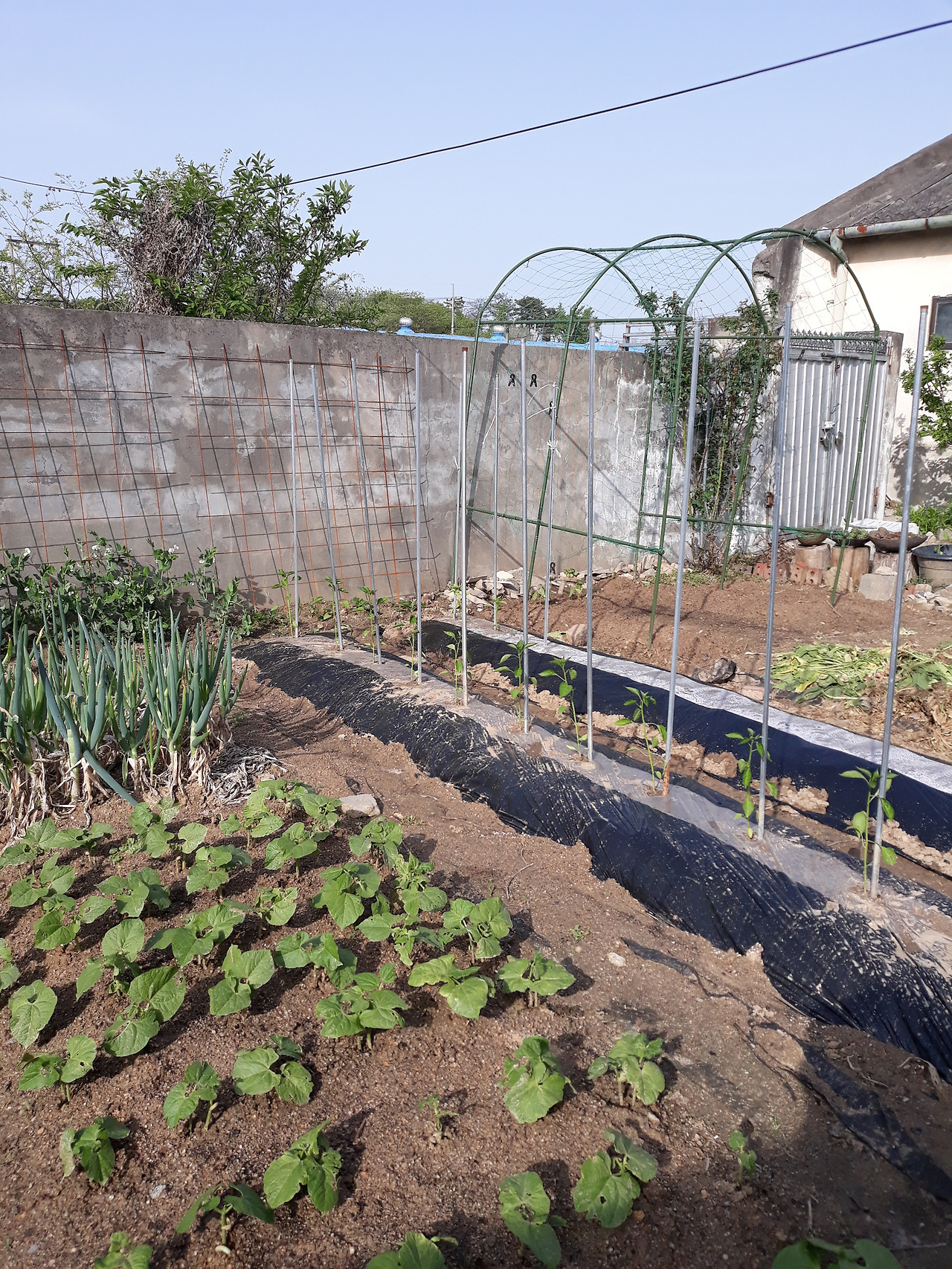 엄니 시골집 마당에 평상이 생겼다. 그리고 지난 주에 엄니가 보내온 꽃, 텃밭, 웃고 있는 콩자 사진.