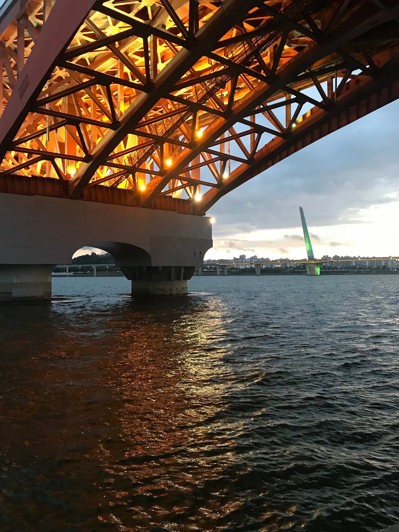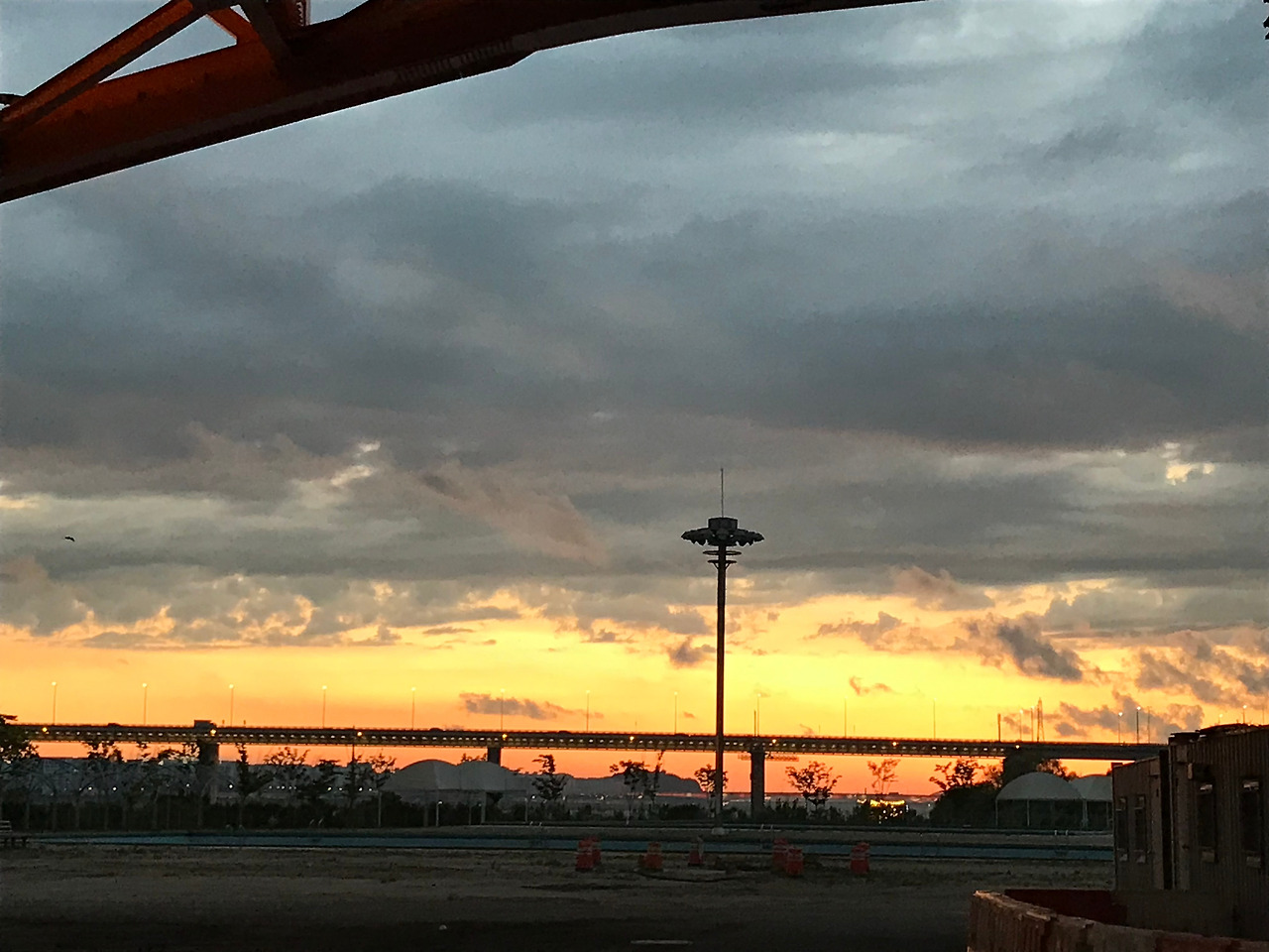 한강공원 교차로에 가까워질 수록 높은 건물은 점점 더 없어져 건물에 자리하던 붉은 빛들은 거의 사라져갔고, 그 색들은 유수지체육공원을 등지고 넘어가는 해 근처로 조금씩 흩어진 듯.