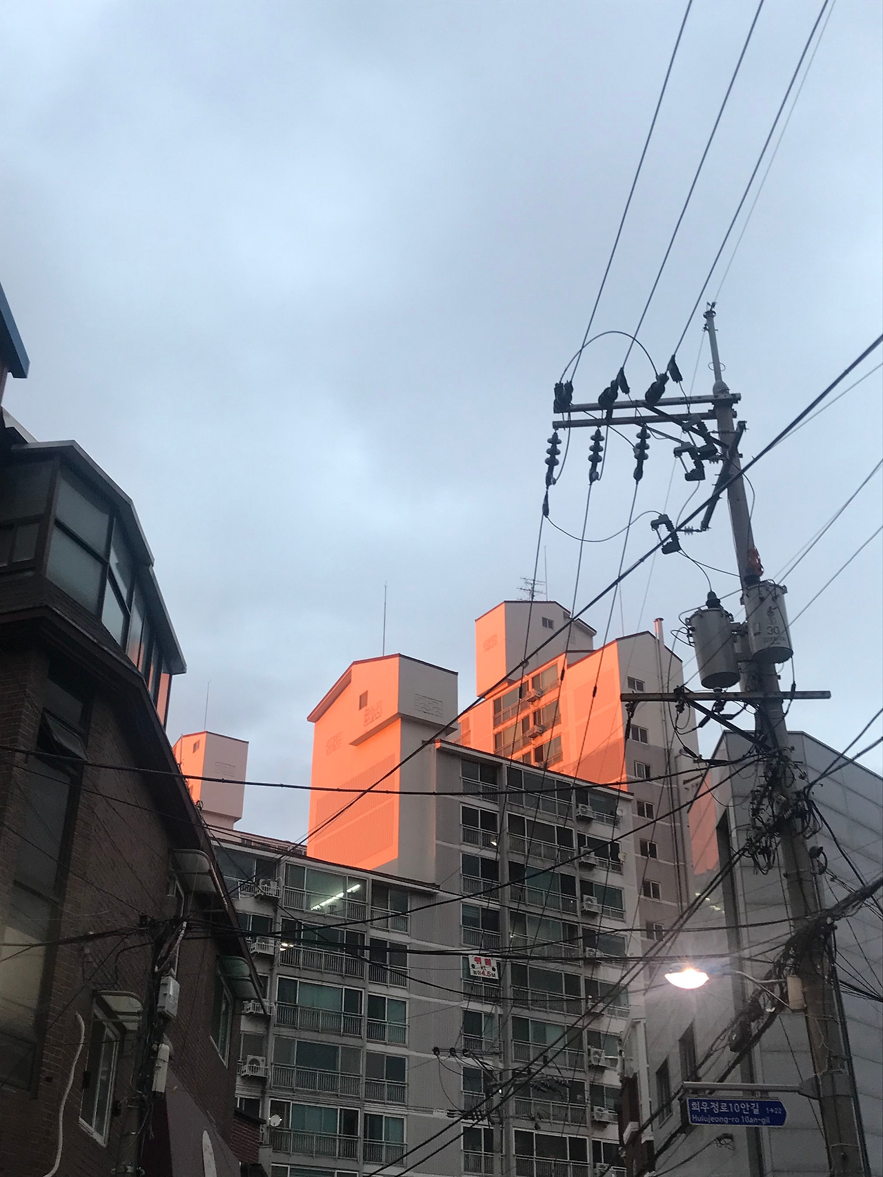 걸으면서 높은 건물들에는 저렇게 붉은 빛들이 내려앉았으나 대림아파트 만큼은 아니었고, 건물이 내게 가까워질 수록 그 색은 조금씩 옅어졌다.