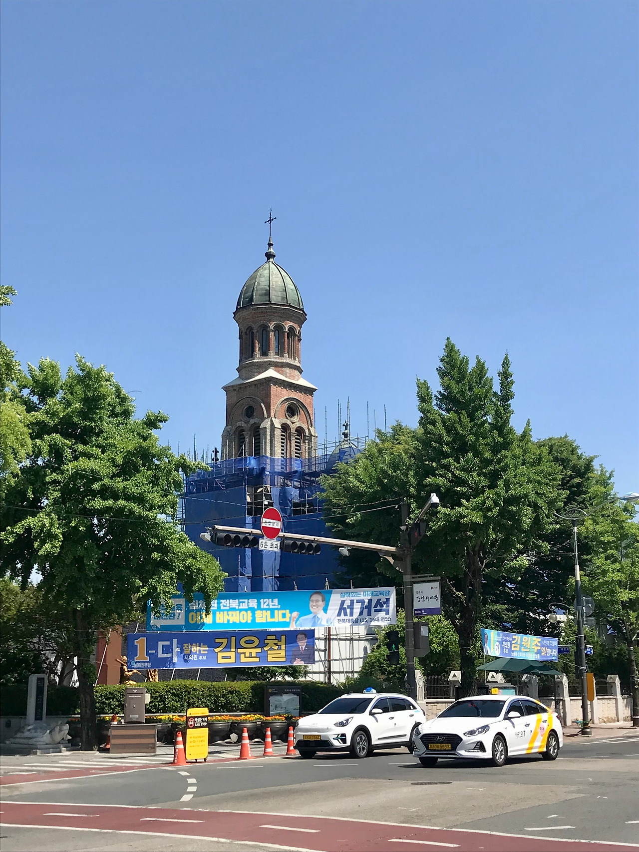 전동성당 건물은 공사중이었다. 오래전에 성당 건물에 큰 화재가 나서 공사한 적이 있었던 것 같고, 이번에는 어떤 이유에선지는 모르겠는데 안전 펜스가 건물 전체를 둘러싸고 있었다.