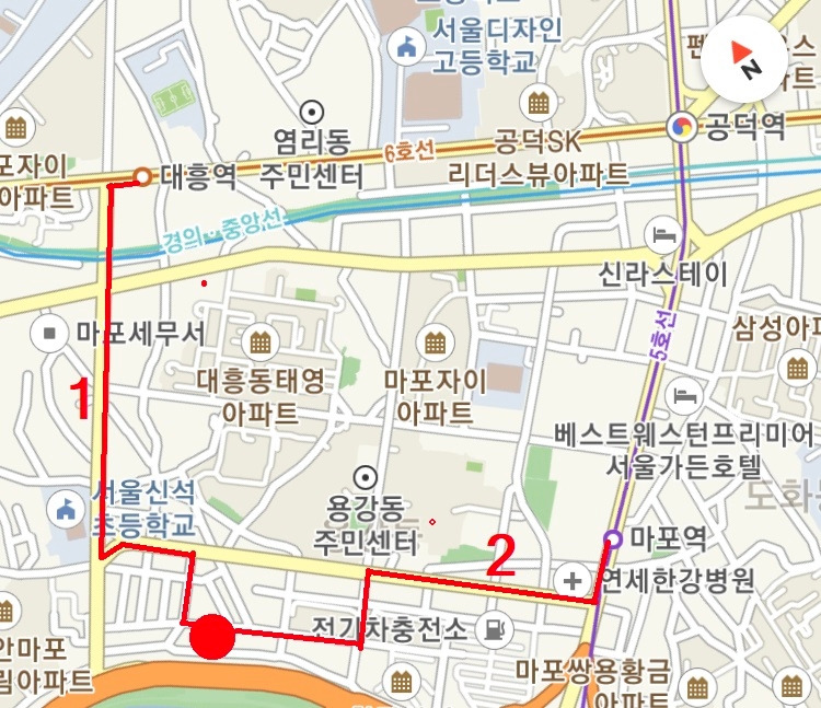 경계를 정확히 나누기는 어렵고, 위치 상 큰 차이가 나지는 않았지만 두 경로는 분위기가 정말 달랐다. 역 주위만 봐도 느낌이 확연히 달랐는데, 대흥역 주변은 바로 옆에 대학교가 있음에도(서강대학교) 새로 개발된 지역도 아니고, 오래되었지만 정돈된 동네의 느낌도 아니었다. 경의선이 가로지르는 신촌과 마포 사이의 점이지대와 같은 느낌이랄까.