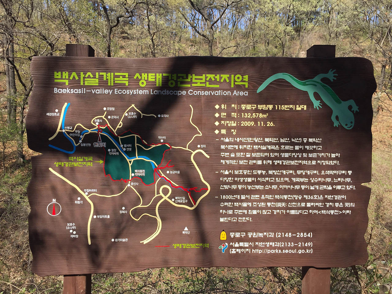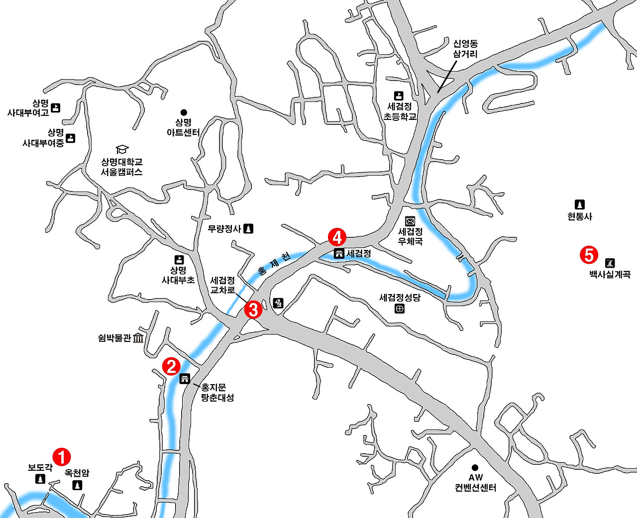 5. 세검정에서 홍제천 물줄기를 따라 걷는다. 세검정성당, 자하슈퍼 등을 지나 계곡과 현통사를 만난다. 백사실마을, 북악스카이웨이, 부암동 등의 방향으로 향할 수 있는 길목인 별장터를 만나 각자의 길을 정한다.