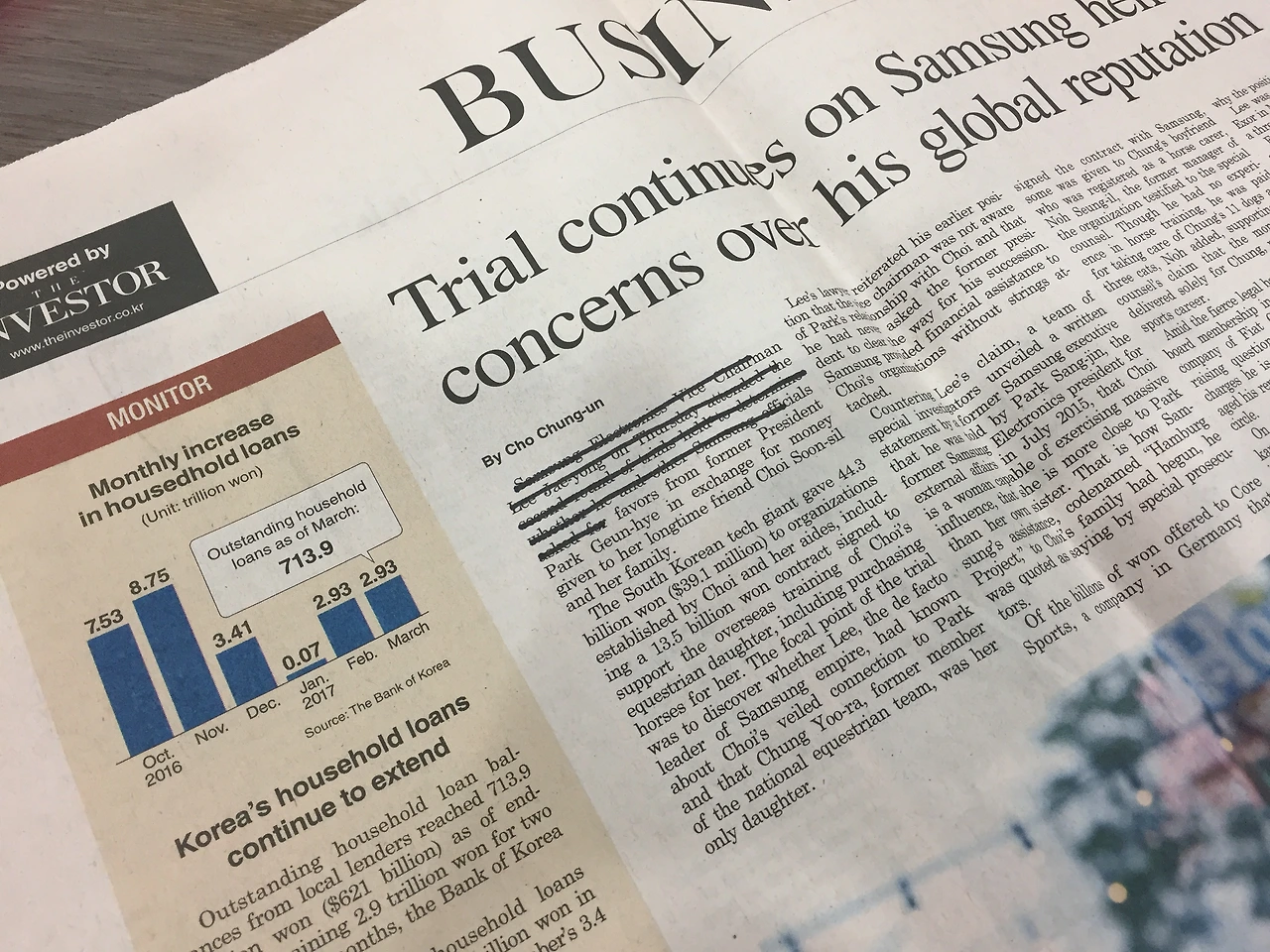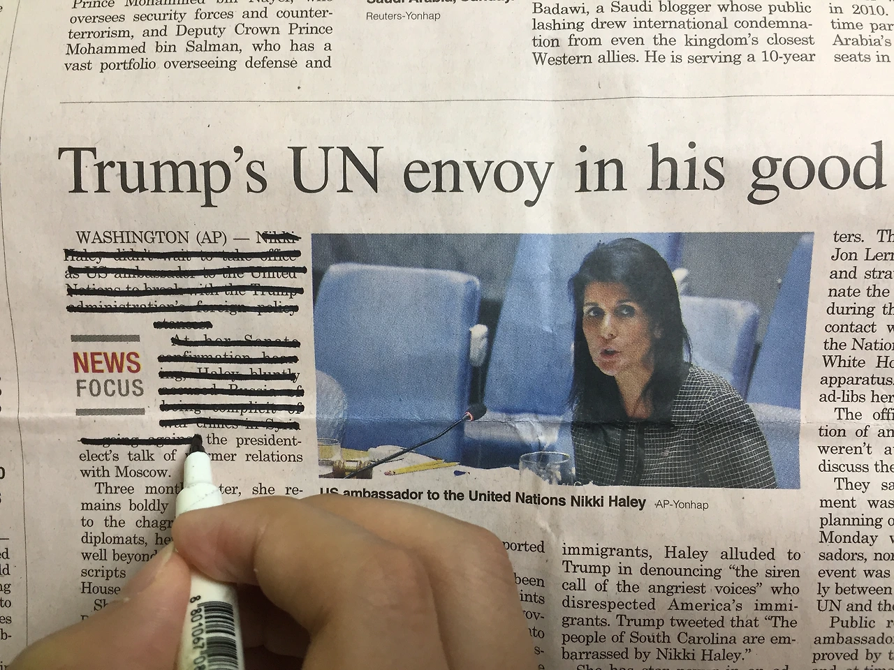 나는 호텔에서 제공된 영자신문을 바로 꺼내 들고 굵은 매직펜으로 문장을 읽어 나가면서, 앞에서부터 단어를 읽는 순간 바로바로 지워 나가기 시작했다. CNN 자막이 화면 왼쪽으로 한 단어 한 단어 사라지던 상황을 그대로 재현하기로 한 것이다.