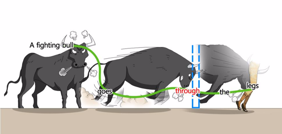 "투우가 투우사 가랑이 사이로 지나가는" 장면을 영어로 말한다고 생각해 보자.