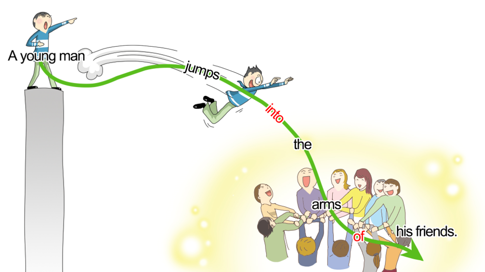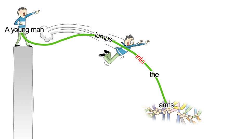 한 젊은이가 -> 뛴다 -> 안으로 들어가고 둘러싸고 있는 것은 -> 그 팔들 ->