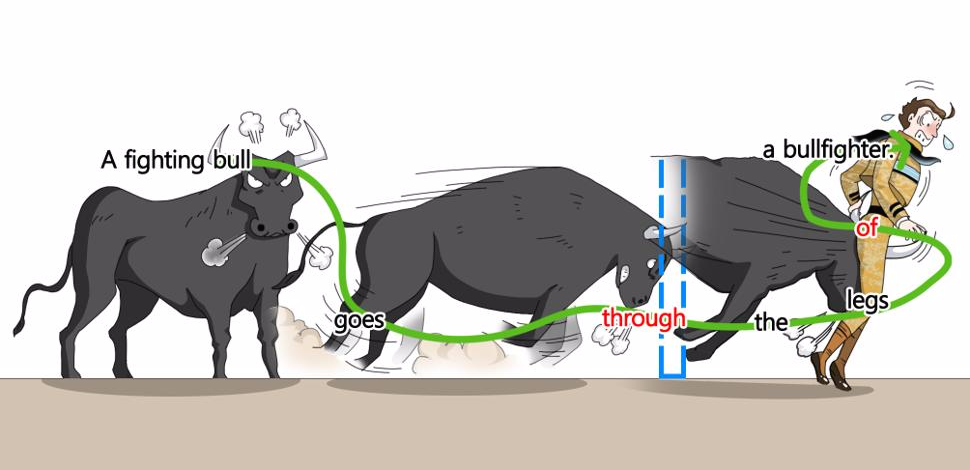 주인공인 투우가 움직이는 순서대로 그 단계를 세분화해서 단어만 나열하니, 말이 되었다. 이 과정에서 예전의 "~ 를 통해서"라는 through는 잊자. 이제 주인공이 움직이는 순서에 따라 "관통하는 대상은 ~ "이라고 바꾸자. of 도 "~ 의"가 아닌 "관련된 대상은 ~"이라고 순서대로 나가아가는 방향에 따라 의미를 바꾸자.