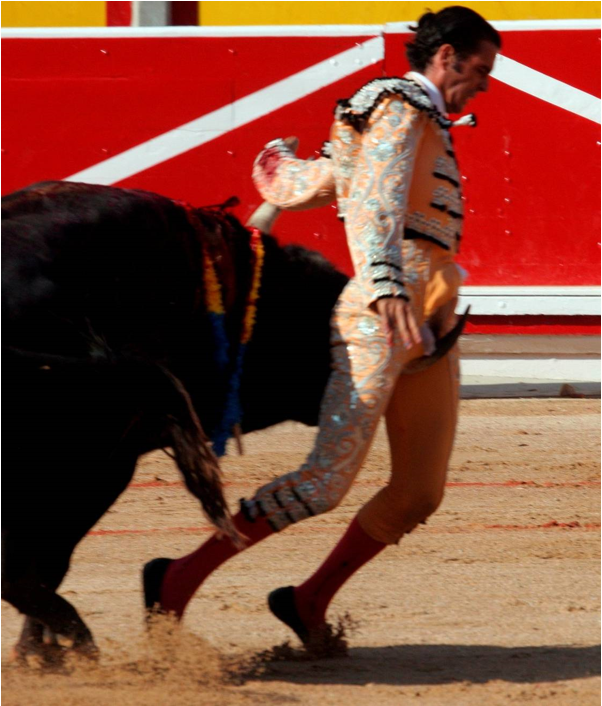 한 마리 투우 -> 간다 -> 관통하는 대상은 -> 그 다리들 -> 관련된 대상은 -> 한 투우사