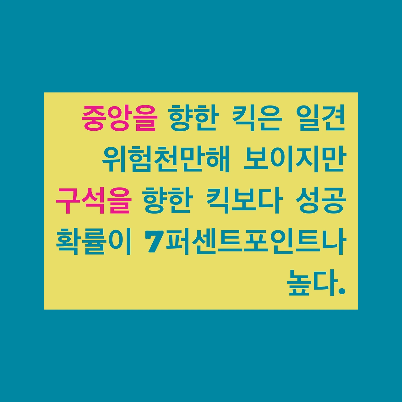 아무튼 이 경우 가운데로 찬 자기 선택에 대한 정당성을 확보하기 어렵기 때문에 기피하게 된다. 쉽게 말해 가운데로 차서 안 들어가면, 좌 또는 우로 차서 안 들어간 것보다 욕을 먹기 쉽다는 것이다.