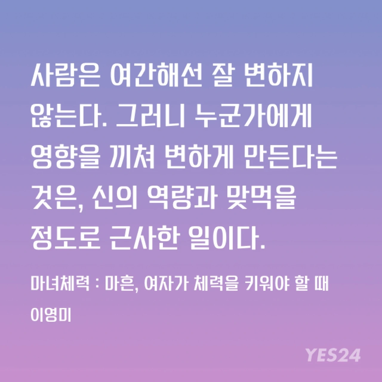 <마녀체력>을 쓴 이영미 작가는 운동이라는 주제를 통해 다른 삶들에 영향을 끼치고 있다. 몸을 움직이지 않는 사람들이 몸을 움직여 더 행복하고 풍요로운 삶을 살 수 있도록 몸소 보여주고 설득하는 방식으로. 그녀의 메시지는 글로, 또는 강의 형태로 대중에 전달된다. 강의보다는 글이 더 많은 사람에 닿을 수 있다.