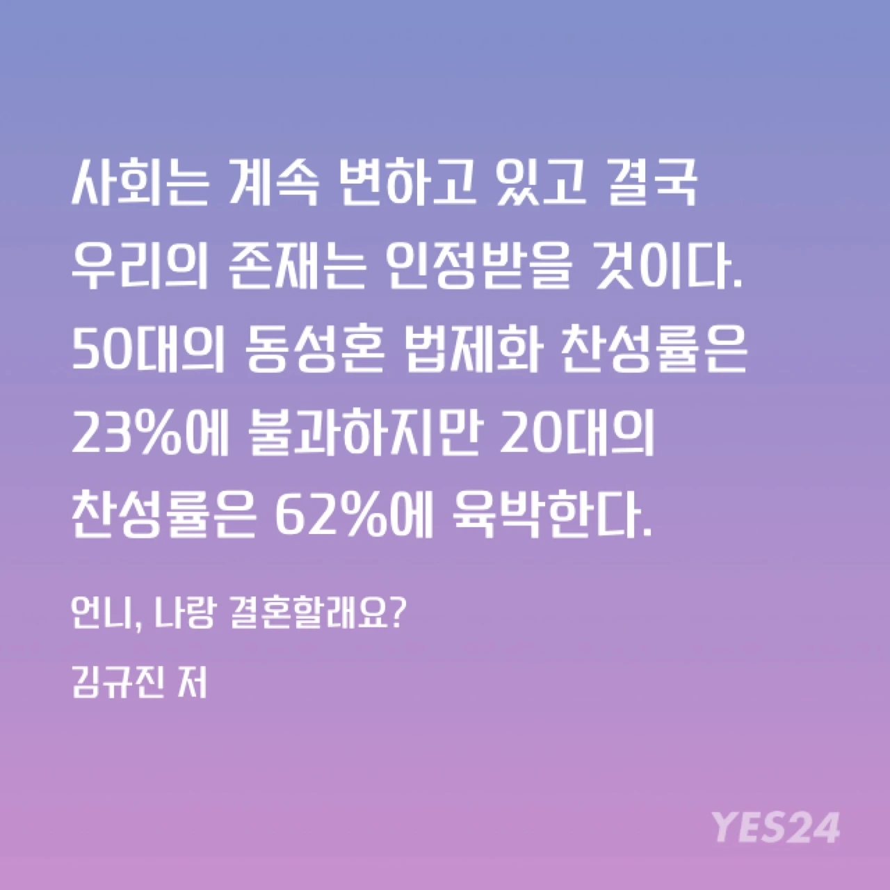 우리는 동성애, 동성혼에 대해 얘기하는 데 익숙지 않다. 사회 분위기가 아직 그렇다. 하지만 이건 시간문제일 뿐 변하게 되어 있다.