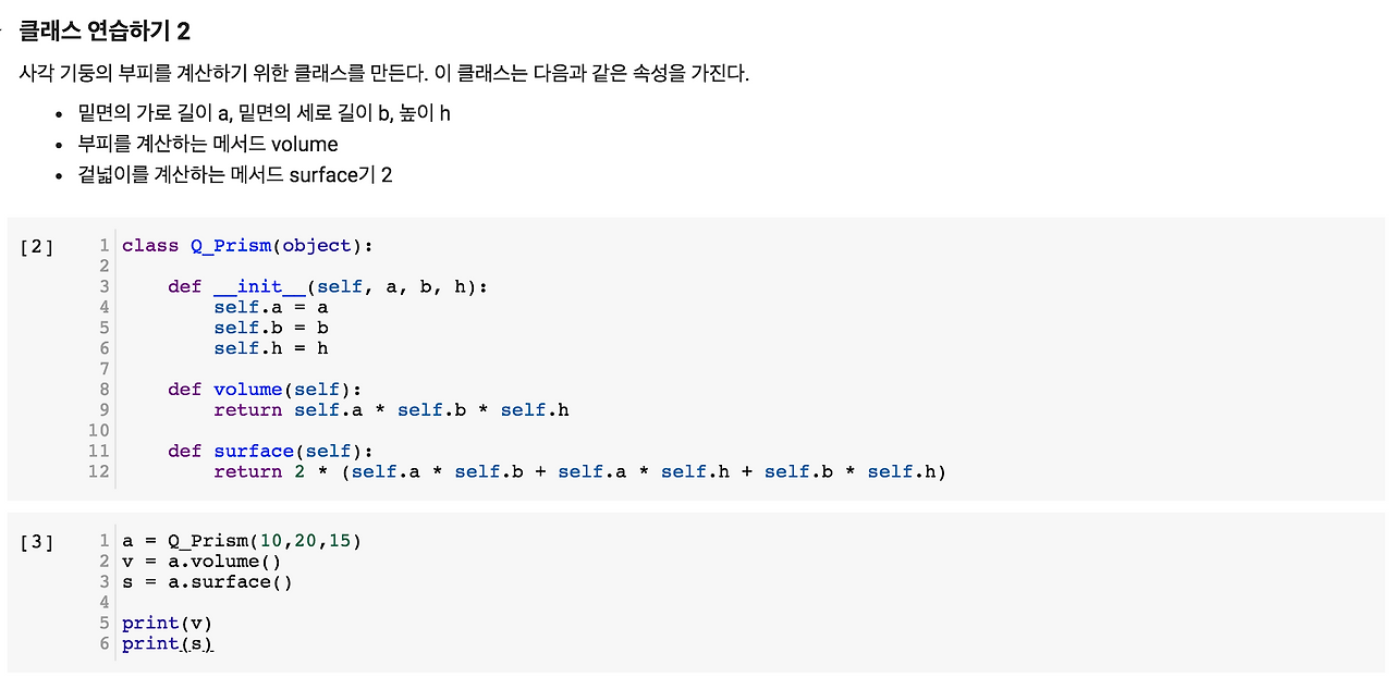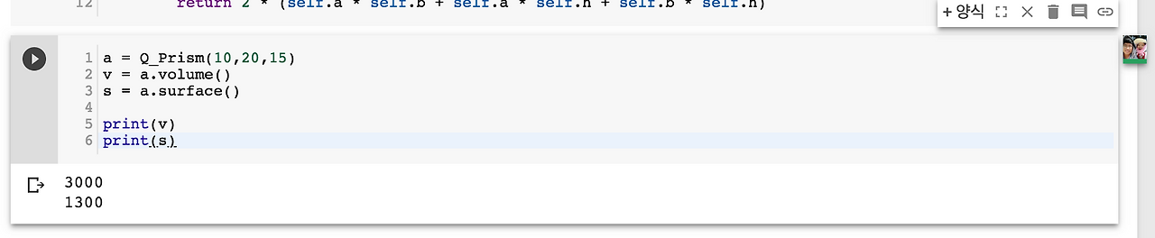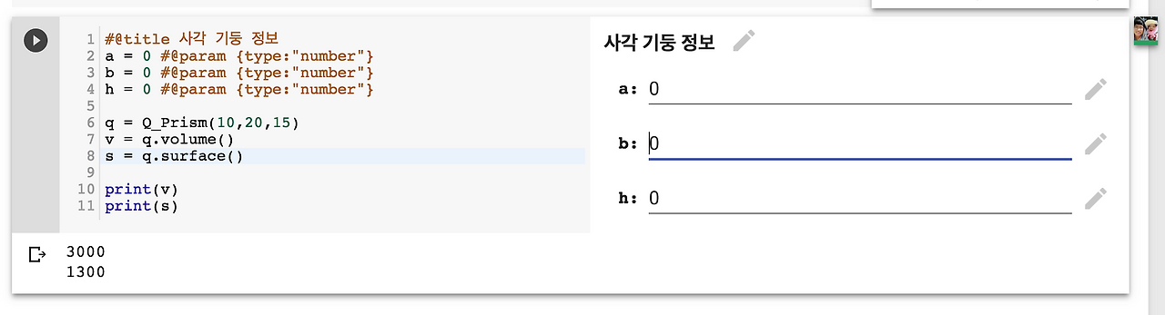 위의 실습 예제에서, 사각 기둥의 변수값인 가로 길이 a, 세로 길이 b, 높이 h 가 존재합니다.