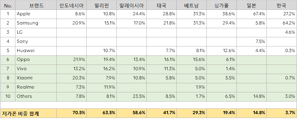동남에서는 저사양 스마트폰 수요가 상당합니다. Oppo, Vivo 및 샤오미 등 저가폰 기준 동남아에서 인도네시아는 70.5%로 가장 높은 비중을 보이고 있습니다. 이어 필리핀, 말레이시아, 태국, 베트남 순입니다. 일본은 저가폰 비중이 14.9%, 한국은 3.7% 수준에 불과합니다.
