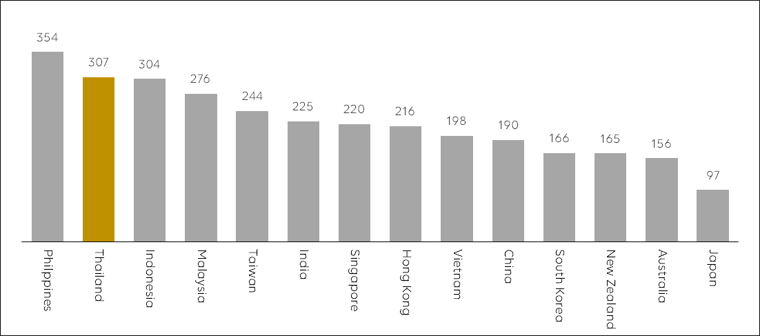 [아시아 퍼시픽 국가들의 일평균 모바일 인터넷 사용 시간 (분), 2020년]