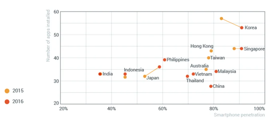 그 결과, 동남아에서는 평균 앱 설치수가 적습니다. 구글에서 발표한 2016년 ‘아·태 지역 모바일 앱 보고서'에 따르면 2016년 한국 소비자가 설치한 평균 앱 개수는 53개로 조사 대상 10개국 중 압도적 1위였습니다. 2~3위인 싱가포르, 필리핀은 평균 설치 앱이 각각 44개, 39개 수준이었습니다. 한편, 태국, 베트남, 인도네시아, 인도는 30~35개 대로 하위권에 포함되었습니다.