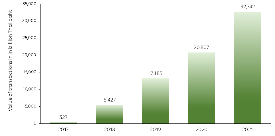 [태국 프롬프트 페이 결제액 추이 (2017~2021, 십억 밧)]