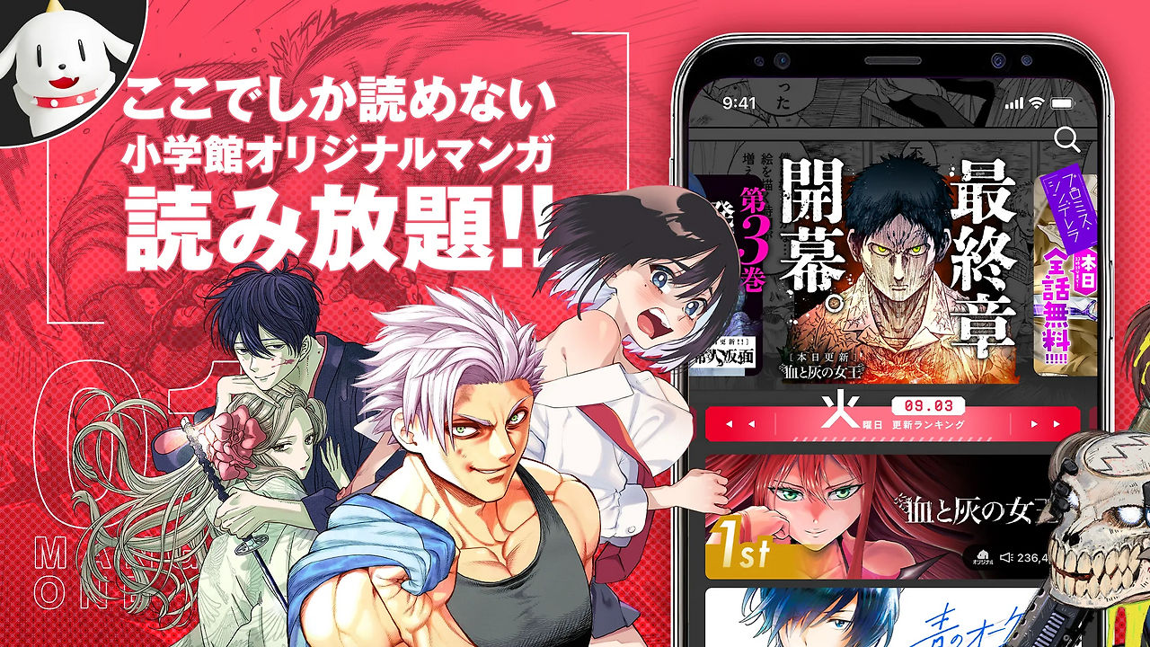 이 플랫폼은 다양한 장르의 만화를 제공하며, 신인 작가 발굴에도 중요한 역할을 하고 있습니다. 대표 작품으로는 《당신은 저승님(君は冥土様)》, 《나와 탈출하지 않으시겠습니까?(私と脱出しませんか?)》, 《아저씨와 냥키치(オヤジとにゃん吉)》 등이 있으며, 독특한 스토리와 개성적인 그림체로 독자들에게 사랑받고 있습니다. 또한 《터치》, 《명탐정 코난》, 《절대가련 칠드런》, 《사상 최강의 제자 켄이치》, 《MAJOR》 등 인기 고전 작품도 매일 1화씩 무료로 제공됩니다. 이를 통해 팬들에게는 추억을, 새로운 독자들에게는 신선함을 제공합니다.