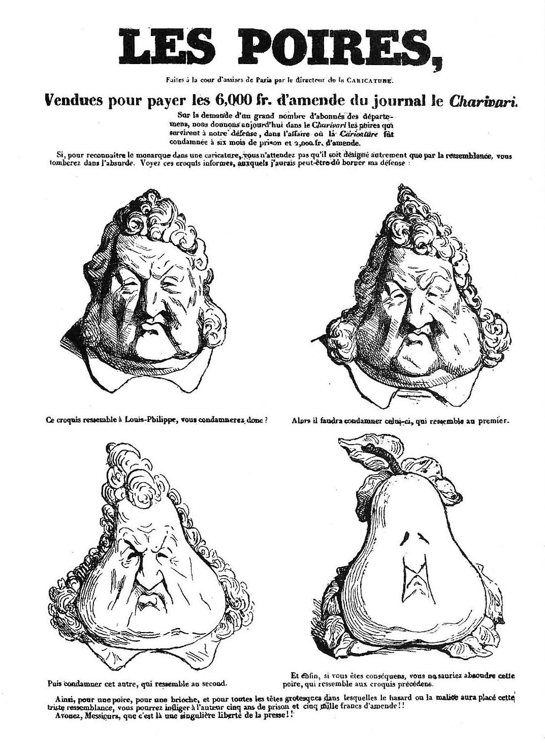 1831년, 필리퐁은 자신의 풍자화로 인해 국왕모독죄로 기소되어 법정에 서게 되었습니다. 그는 이를 단순한 재판이 아니라 표현의 자유를 위한 투쟁으로 여겼습니다. 재판 중 필리퐁은 루이-필리프의 얼굴이 점진적으로 배로 변해가는 4컷의 스케치를 그리며 "이는 단순한 배 모양의 변형일 뿐입니다"라고 주장했습니다. 이 사건은 그의 '불경 캠페인(campagne de l'irrespect)'의 시작이 되었고, 결국 6개월의 징역형을 선고받았습니다.