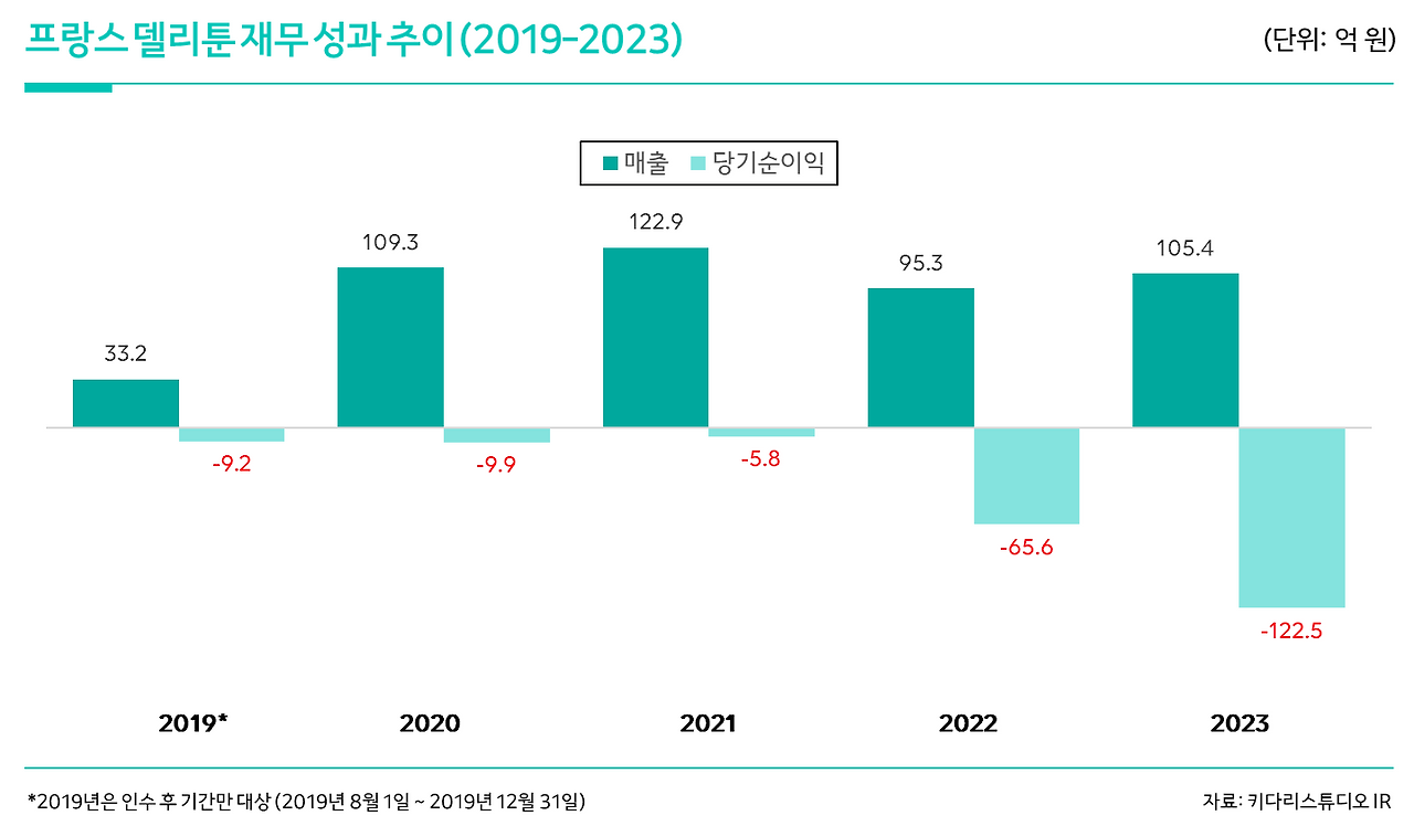 하지만 성장의 여정에서 재무적 어려움을 피할 수는 없었습니다. 2022년 매출은 95억 원으로 전년 대비 22% 감소하며 역성장을 보였고, 2023년 매출은 105억 원 수즌올 2020년 수준으로 다시 회복되었습니다. 한편, 델리툰의 수익성은 여전히 개선이 필요한 과제로 남아 있습니다. 2020년부터 2023년까지 델리툰은 적자가 지속되었으며, 2022년에는 -65.6억 원, 2023년에는 -122.5억 원의 손실을 기록했습니다. 이러한 손실은 독일어 서비스 확장을 위한 인건비와 마케팅 비용 증가에서 주로 기인한 것으로 보입니다. 그럼에도 키다리스튜디오는 유럽 시장에서 델리툰의 브랜드 가치를 유지하며, 장기적인 시장 점유율 확대를 목표로 지속적으로 전략을 강화하고 있습니다.