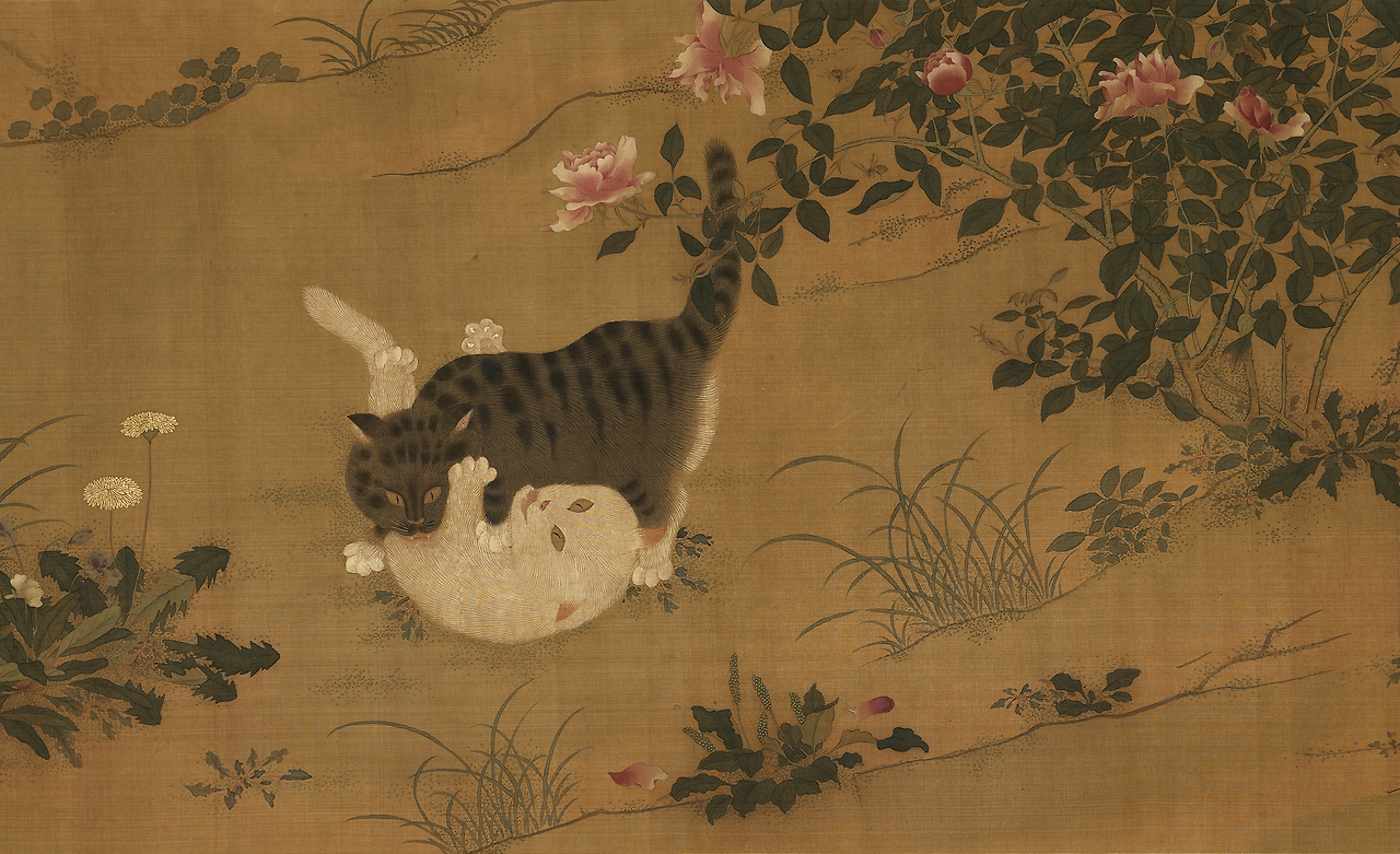 남송의 대표 화가 이적(李迪, 1100년경-1197년 이후)은 고양이의 우아함과 독립적인 매력을 깊이 있는 시선으로 담아냈다. 그의 작품 《리노소영도(狸奴小影圖)》는 금빛 털을 지닌 고양이의 부드러운 결과 날카로운 눈빛을 대비시켜 고양이 본연의 품격을 강조했다. 《리노잠앵도(狸奴蜻蜓圖)》에서는 공중에 떠 있는 잠자리를 주시하는 고양이의 집중된 눈빛과 긴장된 자세를 통해 사냥 본능의 생동감을 극대화했다. 또 다른 작품 《추규산석도(秋葵山石圖)》는 얼룩진 털을 가진 고양이와 검은 개가 대치하는 순간을 담아냈으며, 두 동물의 표정과 태도가 극적으로 대비되며 긴장감을 자아낸다. 이적의 작품들은 고양이를 단순히 묘사하는 것을 넘어, 그들의 성격과 본질을 탐구하며 인간과 자연 사이의 깊은 교감을 시각적으로 표현했다.