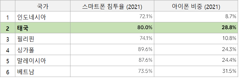[동남아시아 스마트폰 침투율 및 아이폰 비중]