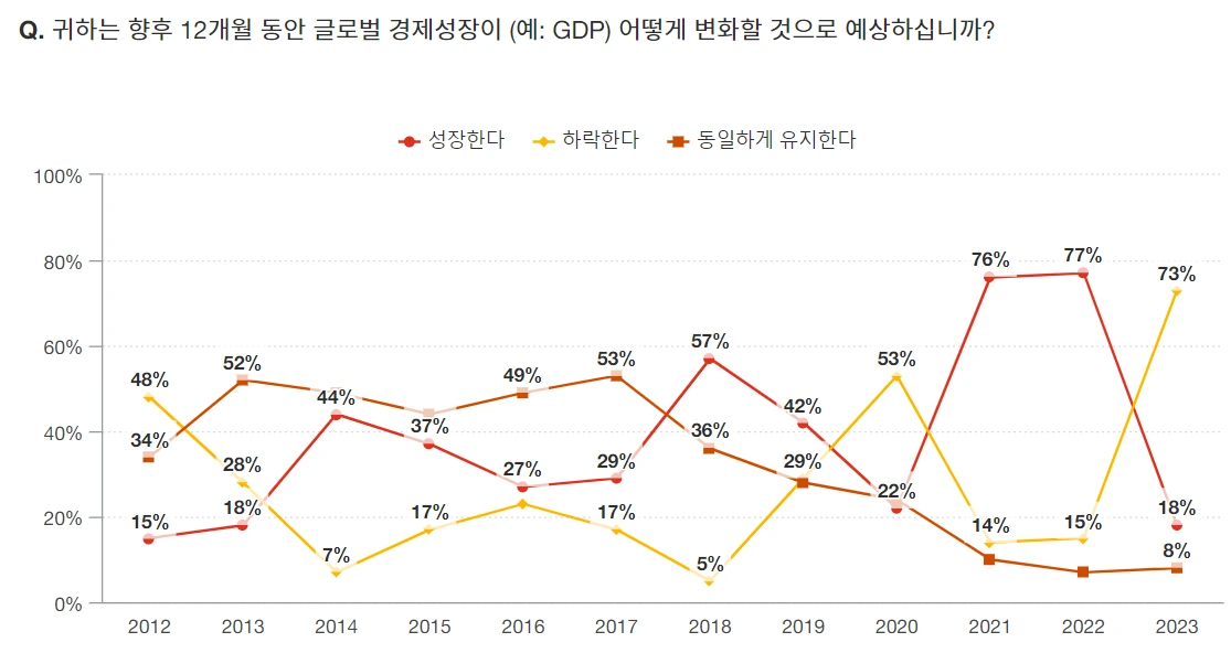 하지만, 낙관론 이면에서는 ‘어둠(Gloom)’과 ‘비운(Doom)’을 감지한 현실적 ‘인식’이 지배적입니다. PwC는 다보스포럼 이전 전 세계 4,410명의 최고 경영진을 대상으로 한 CEO 서베이 결과를 발표했습니다. 그 결과, 73%가 앞으로 경제가 쇠퇴할 것이라 응답했습니다. 이는 코로나가 성행했던 2020년, 쇠퇴한다고 응답한 53%보다 높은 수치로 지난 10년 기준 역대 최대치를 기록했습니다. 몇 가지 벌어지고 있는 ‘현실‘들도 낙관론을 뒷받침하기에는 역부족입니다.