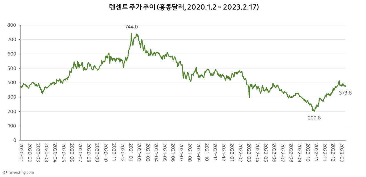 텐센트의 주가가 반등하고 있습니다. 텐센트 주가는 2022년 10월 31일, 5년간 최저치인 200.8 홍콩 달러까지 하락했다가, 2월 17일 종가 기준 373.8 홍콩 달러까지 2배 가까이 상승했습니다. 시진핑 정부의 빅테크 규제 속에서 실적 악화를 지속하다 2023년 구정 연휴를 전후로 회복세가 완연하게 나타나고 있습니다.