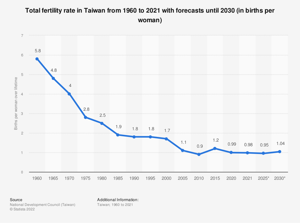 대만의 국가발전위원회 (National Development Council) 예측에 따르면, 대만은 2060년 즈음에는 65세 이상 인구가 41.4%에 도달해 전 세계에서 가장 늙은 국가 중 하나가 될 것이라고 합니다. 일본보다 더 빠른 속도로 노년화되고 있어 대만의 고령화는 심각한 문제가 되고 있습니다. 2008년 글로벌 금융위기가 닥치면서 대만의 출산율은 위험 신호를 보였고, 이에 당시 집권당은 아동 수당, 보육 지원 제도, 육아 휴직 등 다양한 세제 혜택을 도입했습니다. 이에 합계출산율은 2010년 0.9에서 2012년 1.27로 반짝 반등하기도 했습니다만 흐름을 바꾸지는 못했습니다. 주거비, 교육비, 간호비, 돌봄비, 장시간 노동에 따른 저임금 등의 비용 증가로 상황은 더욱 악화되고 있고, 최근 중국과의 국제 긴장 관계는 더더욱 젊은 층의 미래에 대해 ‘암울한 예측’을 더하면서 출산율 저하를 가속화시키고 있습니다.