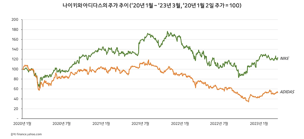 나이키와 아디다스의 주가 격차가 더 벌어지고 있습니다. 각 회사의 2020년 1월 2일 주가를 100으로 환산해 보면, 2023년 3월 31일 기준으로 나이키는 24% 상승한 반면, 아디다스는 47% 감소했습니다. 코로나 시기를 거치면서 주가 격차가 커지고 있는 셈입니다.