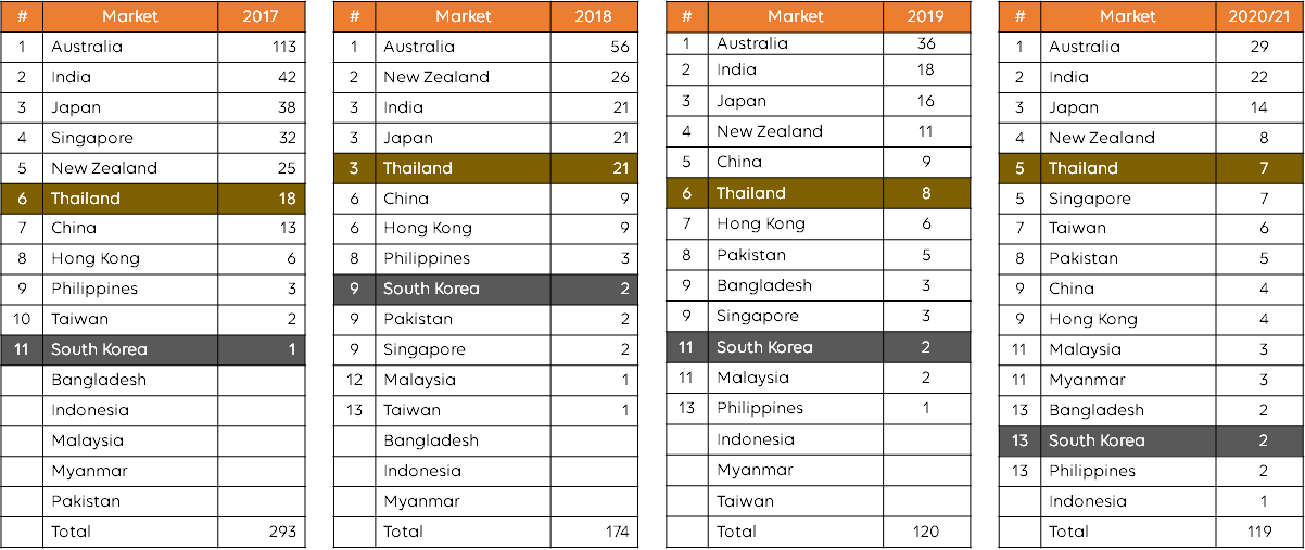 그 결과, 태국은 국제 광고제를 휩쓸고 있습니다. 세계 3대 광고제 중 하나인 칸느 국제광고제만 살펴봐도 태국은 아시아내 상위권 국가입니다. 한국의 저조한 실적과는 확실히 대비됩니다.