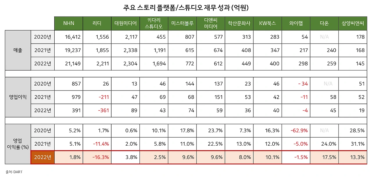 최근 주요 웹툰 사업자들의 2022년 사업 실적이 발표되었습니다. 매출이 위축된 사업자가 대부분인가 하면, 수익성은 확연하게 감소했습니다. 코미코를 운영하는 NHN의 수익성은 5%대에서 2022년 1%대로 쪼그라들었습니다. 시장에서는 코미코 매각 소식도 들릴 정도입니다. 리디는 매출이 2021년 1,800억대에서 2022년 2,200억대로 20% 상승했지만, 영업이익은 악화되었습니다. 2022년 초 1조 6천억 원을 기록한 기업가치가 절반 가격에도 거래가 안되고 있다는 소식도 들립니다.