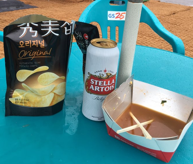 더 걸을 수도, 집으로 돌아갈 수도 없이 빗속에 남겨진 나. 일단 배를 채워야겠다 싶어 편의점에 들어갔다. 라면을 하나 사서 먹다 보니 맛이 일품이었다. 아무도 없는 주말 아침에 빗소리를 들으며 한강에서 먹는 라면은 혼자여도 괜찮았다. 라면을 다 먹을 즈음에 이 순간이 아쉽단 생각이 들었다. '조금 더 여유 있게 즐겨볼까?' 다시 편의점으로 들어가 맥주 한 캔과 감자칩 한 봉지를 샀다. 돈을 가지고 나오지 못했지만 다행히 핸드폰의 카카오페이 기능이 제 몫을 해 주었다. 준비 없이 다가온 상황에서도 살아갈 방법은 있다더니 오늘 같은 날을 두고 하는 말인가 보다. 어쨌든 내 눈앞에 펼쳐져 있는 잔잔한 한강, 그리고 거칠게 쳐대는 빗줄기였지만 이 상황을 만드는 모든 것이 나와 함께라는 생각이 들었다. 그리고 이 아침의 적막함과 난처함을 낭만으로 바꿔준 먹다 남은 라면 국물과 감자칩 그리고 맥주 한 캔이 주는 위로는 대단했다.