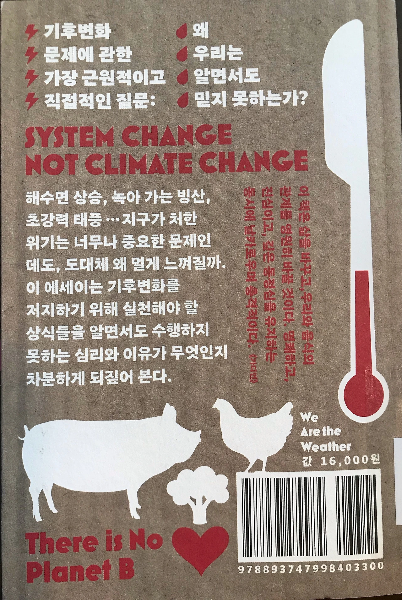 기상청은 지구가 기후위기시대에 접어들었음을 보여주는 ‘2020년 기후분석 결과’를 지난 1월에 발표했다. 2019년 12월에서 2020년 2월까지 겨울 기후는 1973년 이래 가장 기온이 높았으며, 역대 가장 긴 장마철과 집중 호우로 중부와 제주에서 각 54일, 49일 동안 비가 내렸고, 총 23개 발생한 태풍 중, 4개가 8월에서 9월 초까지 우리나라에 영향을 주었다고 한다. 3월은 기온이 높았고, 4월은 쌀쌀했던 날이 많고, 6월에는 이른 폭염이 한 달간 지속되었으나 7월은 선선했던 날이 많아 6월 평균기온이 7월보다 높은 현상이 나타나는 등 심하게 널뛴 기온 변동을 보였다. 최근에 개봉한 영화 “승리호”에서 지구의 기후 문제로 대체 행성에서 녹색 식물을 키우는 2092년을 상상한 것과 같이 이제 지구 온난화 문제는 더 이상 학자들만의 의제가 아니게 되었다. [엄청나게 시끄럽고 믿을 수 없게 가까운]으로 좋아하게 된 작가 “조너선 사프란 포어”는 동물을 대하는 인간의 태도와 육식에 대한 깊은 통찰력을 보여준 [동물을 먹는다는 것에 대하여 (2009년)]에 이은 두 번째 논픽션 [우리가 날씨다]에서 알고 있지만 실천하지 못하는 사람들에 대해서 상세하게 탐구하였다.