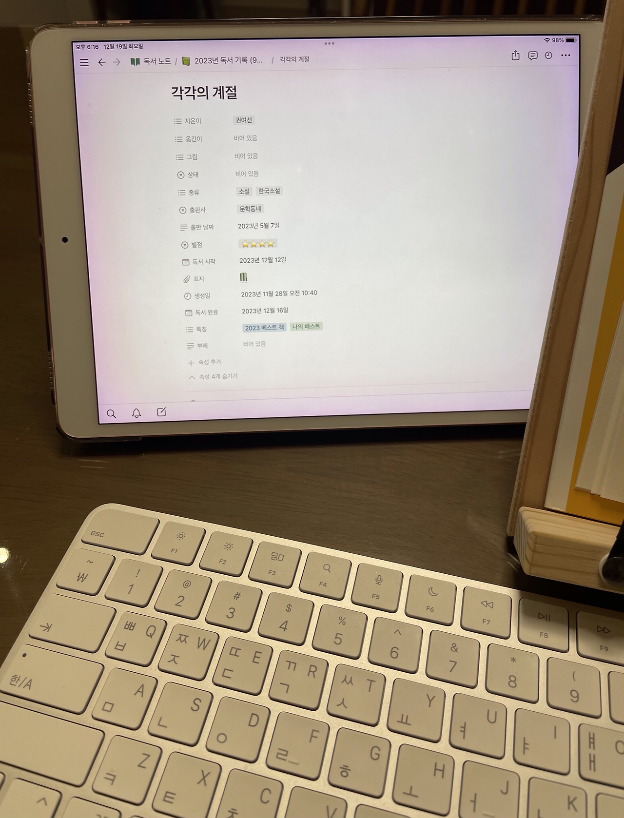 이제는 책을 읽으면, 우선 <노션>과 메모장, 리더스 앱에 책제목과 저자를 기록하고, <노션>을 이용해서 책에 대한 정보(저자/출판사/종류 등)와 서평, 독서 정보, 문장 수집 등을 책을 읽는 과정에 핸드폰이나 아이패드 그리고 PC를 통해서 자유롭게 기록하게 돼서, 책을 읽는 순간의 감정에 충실한 기록을 더 많이 하게 되고, 책 읽기의 경험이 풍부해졌다.