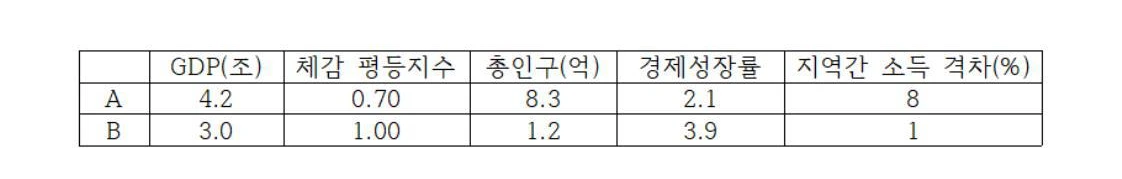 *A와 B는 가상의 사회이며, 각 항목은 임의의 수치임.