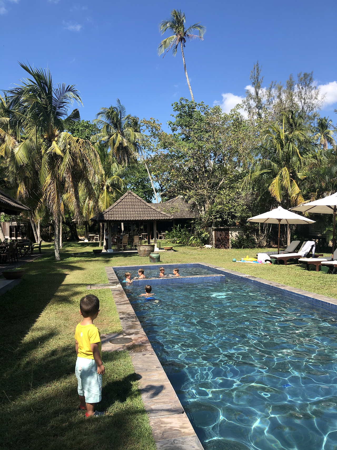 나른한 음악과 함께 바나나 잎사귀에 플레이팅 된 음식이 나오고 모히토 한 잔에 느긋한 레스토랑의 분위기가 평화롭게 느껴졌다. 레스토랑 곳곳에 고양이들이 조용히 지나다녔고, 우리 테이블 앞엔 나이가 꽤 들어 보이는 하얀 고양이가 물그릇 앞에서 졸고 있었다. 아들은 요즘 유치원에서 배운 노래를 때와 장소를 안 가리고 불러대는 통에 입막음용 곰돌이 젤리를 늘 가방에 들고 다녀야 하는데 고양이가 잠든 걸 보더니 자발적으로 나와 남편에게 쉿! 조용히 하란다.