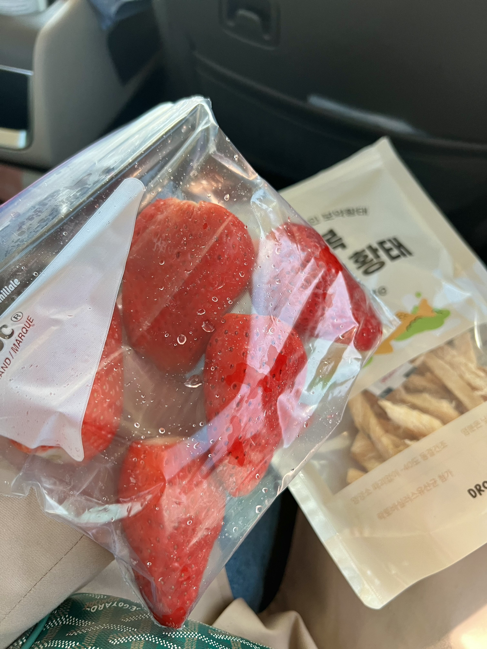 이동 봉사자 긴급 모집에 DM을 보내자 금세 비행 일정과 탑승객 수를 묻는 회신이 왔다. 이후엔 카톡 메신저로 자원봉사자 분들과 앞으로 할 일에 대해 전달받았는데 사실상 번거로운 서류와 검역 준비는 유기견들을 구조한 분들과 보호소 단체 분들이 모든 걸 준비해 주시기에 우리 가족이 공항에서 해야 할 일은 유기견들을 수화물 목록에 올리고 출국 시간보다 한 시간여 먼저 가는 것뿐이었다. 출국 전 날까지 꼼꼼히 설명해 주신 덕에 가벼운 마음으로 두 달이라는 꽤 긴 시간을 지낼 짐들을 챙겨 공항으로 출발했다. 사진으로 만난 유기견 들이지만 10시간여의 비행을 앞둔 녀석들에게 무엇이라도 챙겨주고 싶어 전 날 딸기를 주어도 되는지 사전에 묻고 깨끗이 씻어 준비하였다.