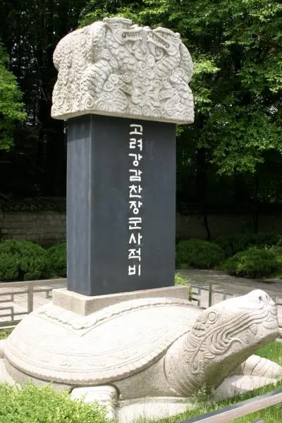 활짝 웃는 얼굴로, 거북이 형상의 석상 위에 세워진 비석을 등지고 서 있었다. 비석에는 ‘고려강감찬장군’이라는 글자가 또렷하게 새겨져 있었다. ( 안 보이는 글자는 사적비였다)