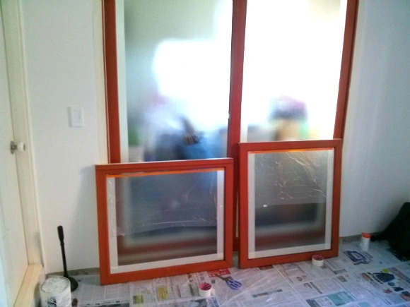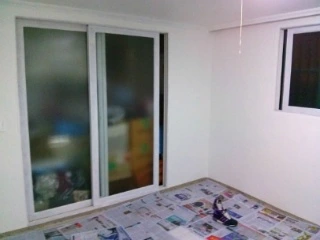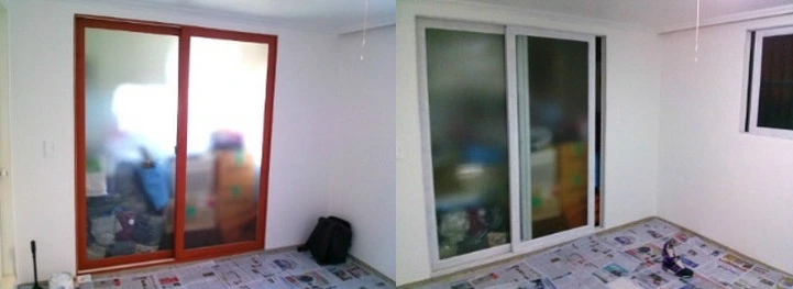 창틀 또한 DAMPLOCK 페인트로 칠했습니다. 통을 들고 다니며 적당한 붓으로 작업했습니다. 페인트의 모든 작업은 2~3회로 덧발라 주셔야 합니다. 유리 부분 쪽에는 비닐 달린 마스킹 테이트를 이용하여 봉인해주시고 페인트 칠을 해주시면 됩니다.