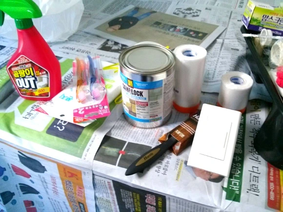 화장실 타일과 문은 물에 노출되어 있습니다. 따라서 물에 강한 페인트를 사용해야 합니다. 이번에도 던에드워드 사장님이 추천하신 던 에드워드 DAMPLOCK 페인트를 칠했습니다. 젯소와 페인트의 효과를 동시에 하여 간편합니다. 1L으로 25,000원입니다. 페인트 작업하실 때에 일회용 비닐봉투와 남은 노끈을 이용하시면 양말 오염을 방지할 수 있습니다.