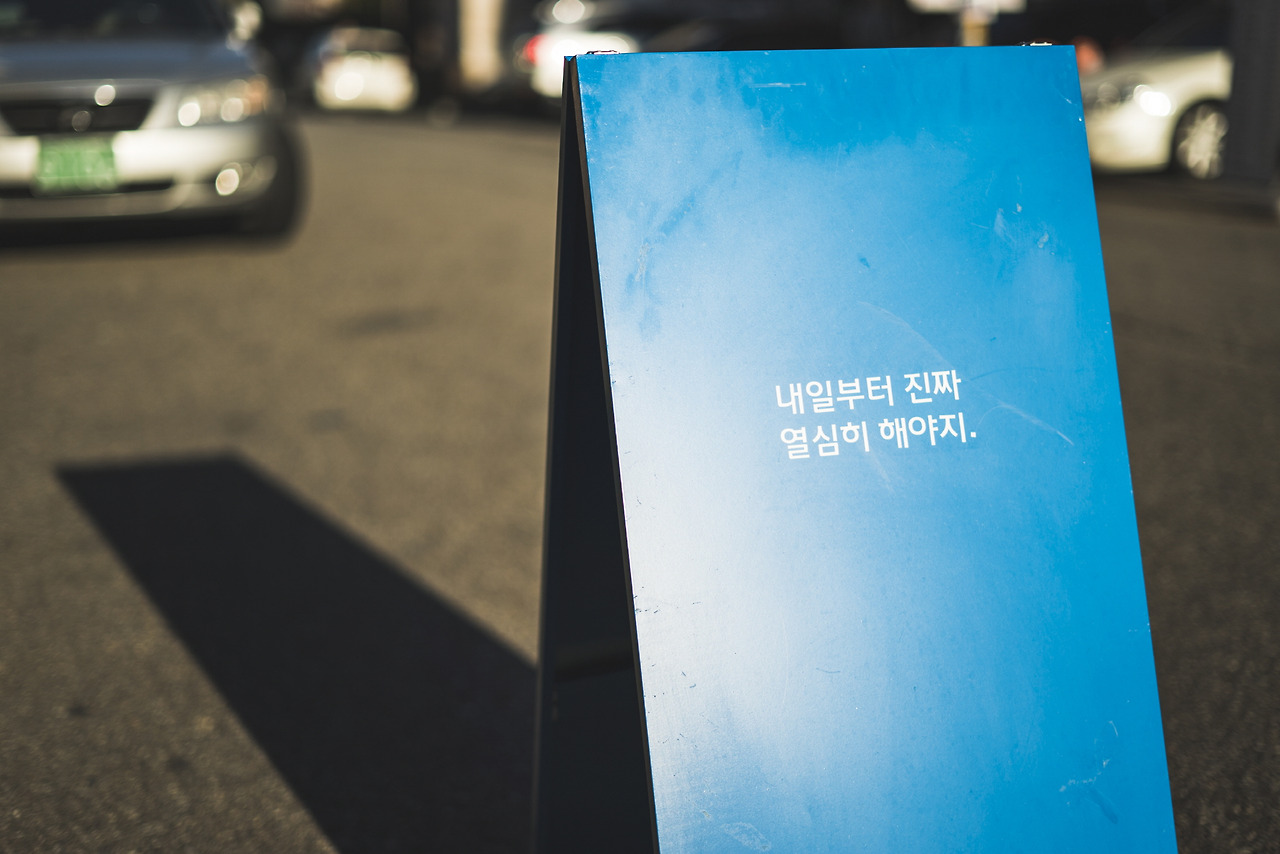 가을이 찾아오나 싶더니 어느새 목도리를 꺼내 들었다. 그나마 햇볕이 드는 오후에는 가을 분위기가 제법 난다. 주말 오후라서 그런지, 아이들도 나와 왁자지껄 놀고 있다. 단렌즈를 오랜만에 들고 나오니, 사진 찍는 맛이 좋다. 성능이 만족스럽지 못하다고 말이 많은 소니 FE50.8에 A7s다. AF 속도는 기대하지 않는 게 좋겠다. 다행히 빛이 많은 주광에서는 초점 속도가 그나마 괜찮다. 도서관으로 향하는 길, 단국대학교 앞 카페 레이지긱(Lazygeek)에 있는 문구가 인상 깊다.